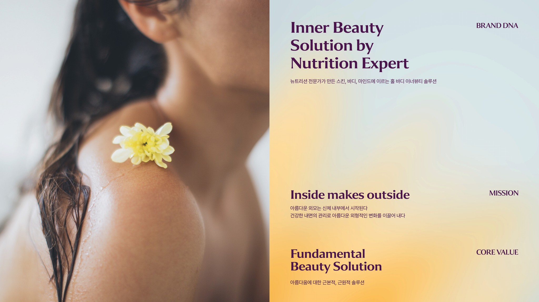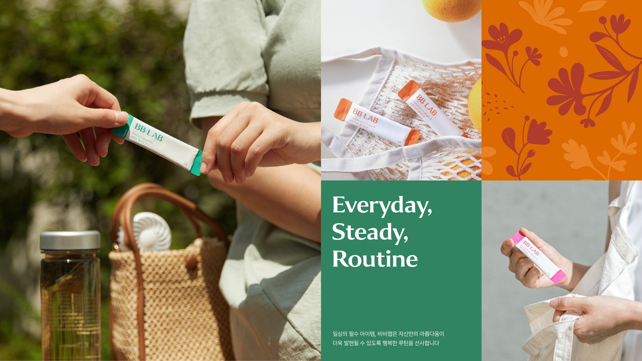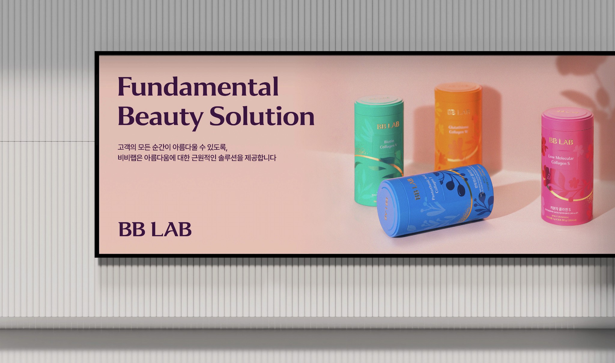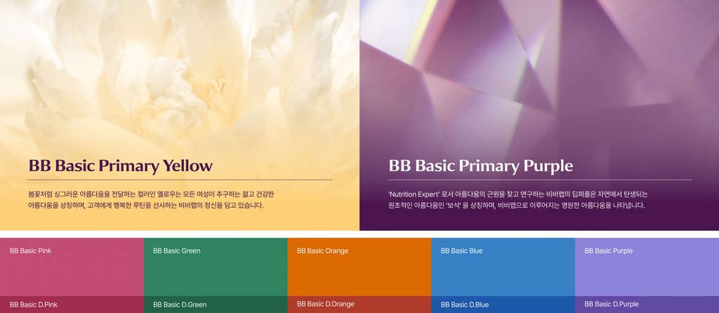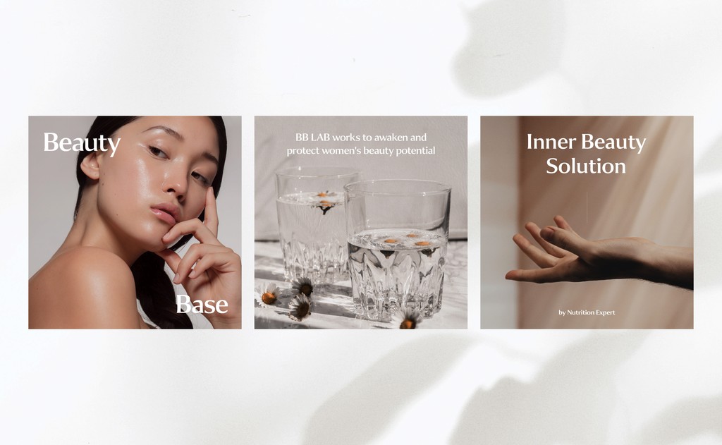 BB LAB은 2019년에 런칭된 ‘뉴트리원’의 건강기능식품 브랜드로, 여성 콜라겐이 대표 상품입니다. 새로운 BB LAB은 평준화 된 이너뷰티 시장에서 차별화 된 모습으로 뉴트리션 전문가들이 개발한 신체 전체를 아우르는 이너뷰티 솔루션을 제공할 것입니다. 곡선을 특징으로 하는 새로운 로고와 자연에서 영감을 받은 그래픽은 조화로운 루틴을 가지는 비비랩을 상징합니다. 이 브랜드는 'inside makes outside'라는 브랜드 미션을 가지며, 외면의 아름다움은 내면에서 시작된다는 철학 아래 소비자를 항상 케어하는 브랜드로써 이너뷰티 시장에서 선도적인 위치를 차지할 것입니다. 건강기능식품 산업군 중 이너뷰티 카테고리는 평준화되어 차별성없는 경쟁을 하고 있는 상황입니다. BB LAB은 이너뷰티 시장에서 성분을 말하거나, 가격을 말하는 것이 아닌 새로운 개념과 가치를 전달하며 이너뷰티 시장의 판도를 바꾸고자 했습니다. 새롭게 정의된 BB LAB의 슬로건 Beauty Base를 우리는 자연에 비유했습니다. 자연이 주는 편안함처럼 피부와, 몸, 마음을 모두 진단하고 케어하는 이너뷰티 솔루션이라는 의미를 담았습니다.