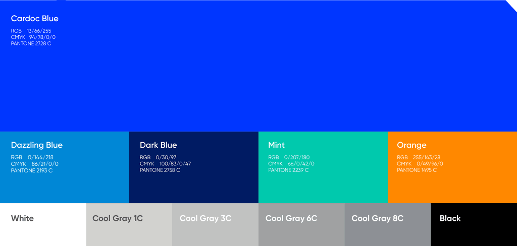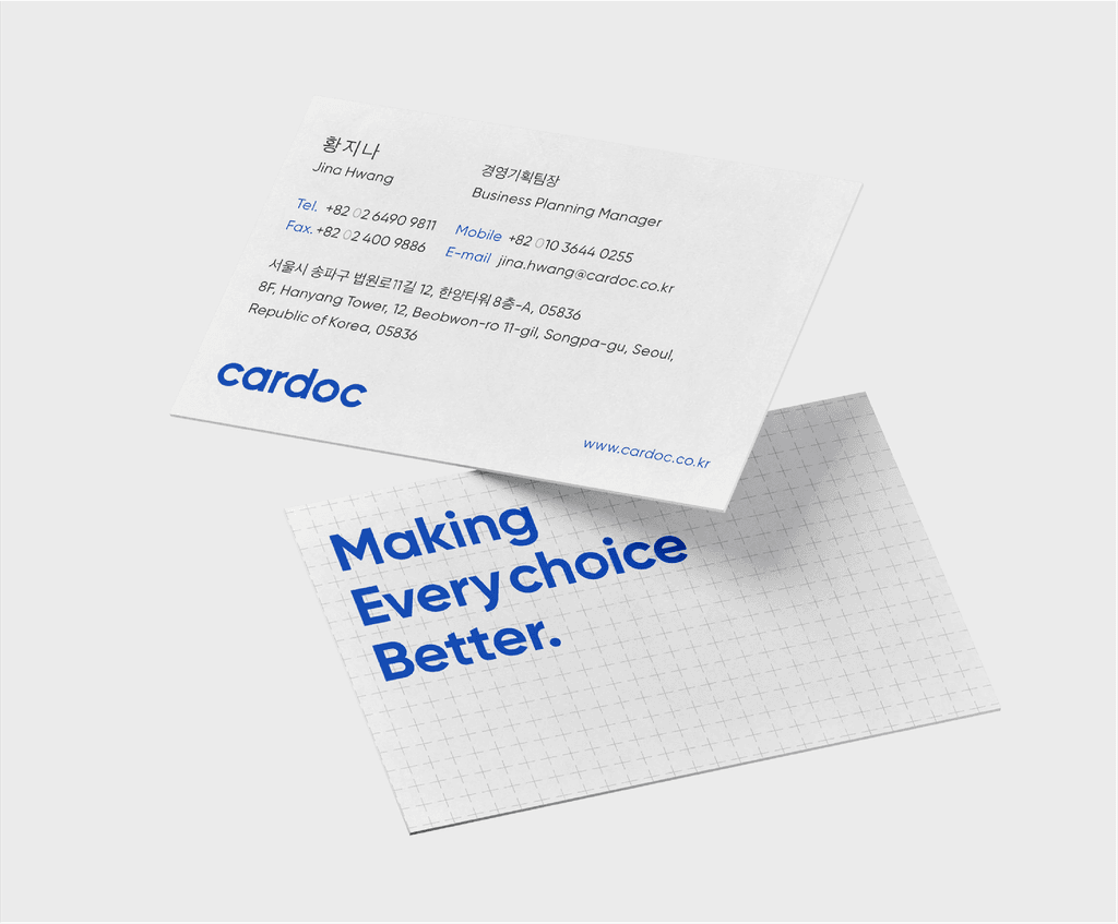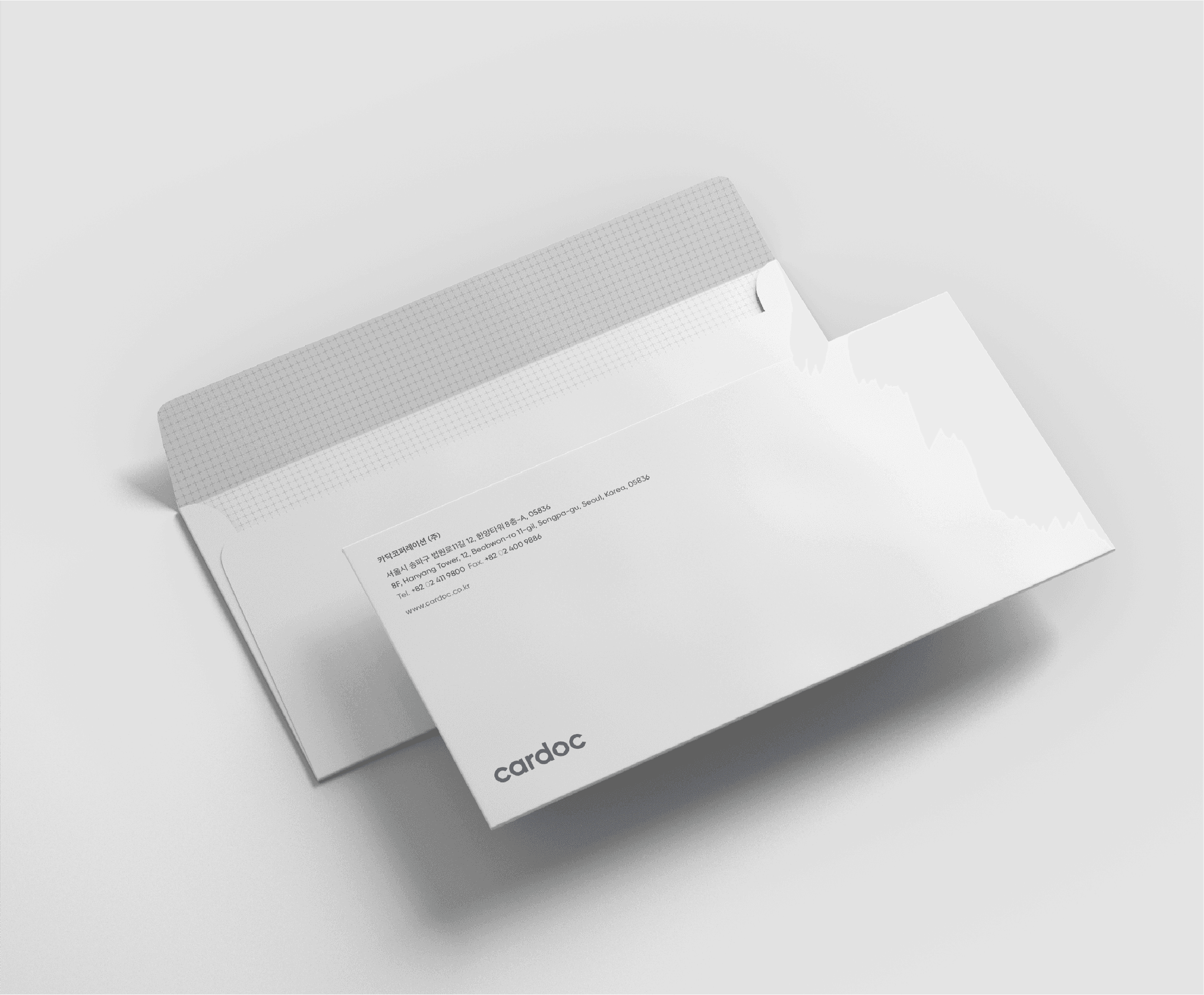 Cardoc의 타이포그래피는 브랜드 로고 심벌에서 느낄 수 있는 조형적인 형상을 닮은 Geometric Sans를 활용합니다. Heavy한 Geometric Sans가 아닌 Light에서 Semi-bold의 웨이트를 사용하여 모바일에 최적화하고 클리어한 브랜드이미지를 구성합니다.