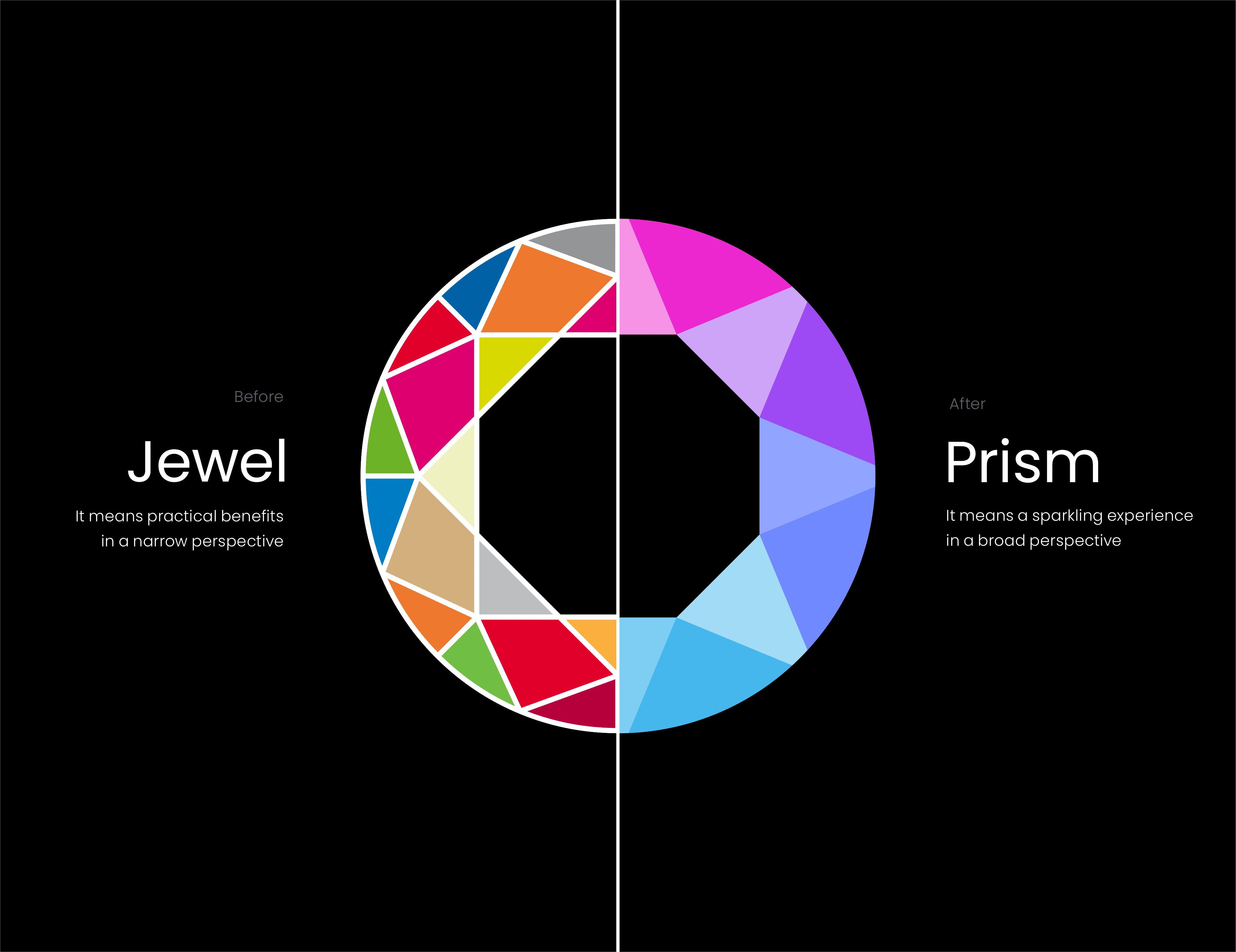 물건 구매와 포인트 적립은 익숙한 소비패턴이지만, 경쟁이 치열해지면서 제휴처와 적립 포인트가 줄어들었습니다. 이로 인해 멤버십 서비스는 단발성 혜택에 집중하며 고객과의 지속적 관계 형성에 어려움을 겪었습니다. CJ ONE은 이를 개선하기 위해 CJ 계열사를 넘어 다양한 브랜드가 참여하는 오픈멤버십으로 전환하고, 포인트 이상의 문화적 혜택을 제공하는 라이프스타일 멤버십으로 재포지셔닝했습니다. 또한, 21년간 유지된 노후화된 브랜드 이미지를 개선하기 위한 대대적인 리뉴얼을 진행했습니다. 모든 그래픽 에셋은 '프리즘'의 형태적 특성과 기능적 속성을 반영합니다. 새로운 로고는 기존 로고의 시각 자산을 계승하여 소비자의 혼란을 줄이고, 작은 화면에서도 효과적으로 보일 수 있도록 견고한 형태로 발전했습니다. 컬러는 프리즘이 빛을 투과하는 모습을 표현하기 위해 톤온톤 그라디언트 팔레트를 활용하며, 아이콘도 반투명 재질과 반짝이는 컬러로 디자인되었습니다. 이를 통해 모든 그래픽 요소에서 소비자는 CJ ONE의 메시지를 느낄 수 있습니다.