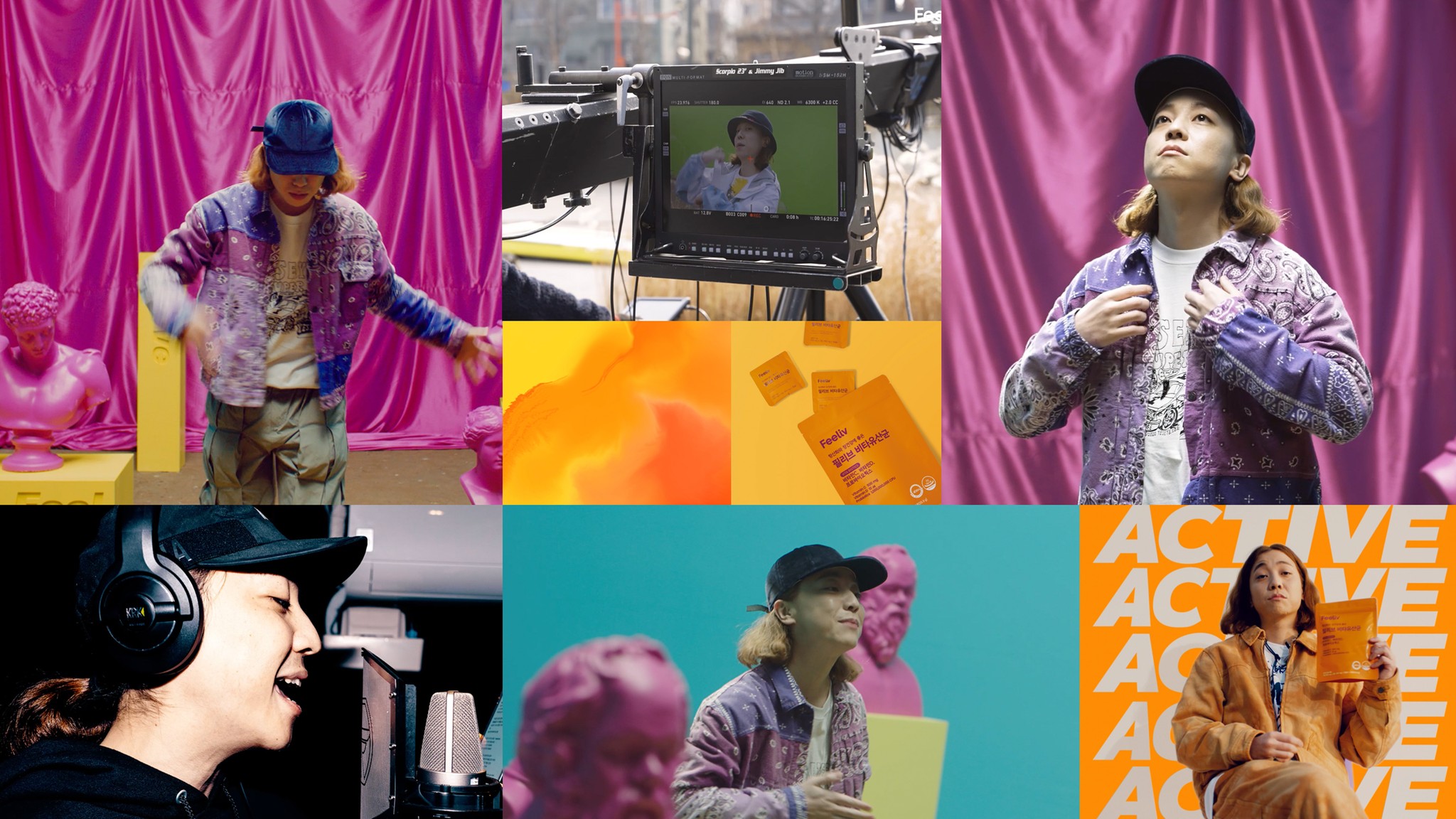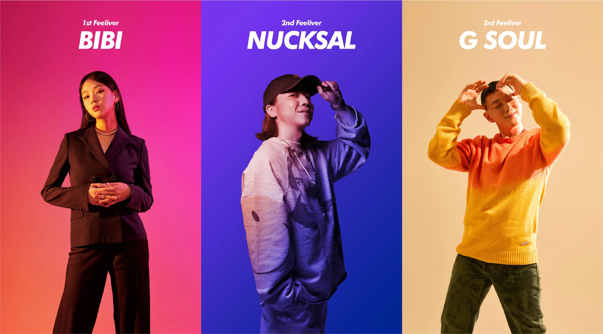브랜드의 개발 이후 제품의 준비가 거의 완료되어가던 2020년 10월부터 컬쳐 캠페인의 아티스트에 대한 검토가 시작되었습니다. Feeliv가 가지고 있는 바이브를 표현해줄 수 있는 다양한 아티스트를 찾던 중 각각의 역할론을 맡아줄 3명이 압축되었는데요, 느낌을 표현하는 비비, 액티브함을 표현할 넉살, 편안함을 상징하는 지소울이 그 주인공입니다.