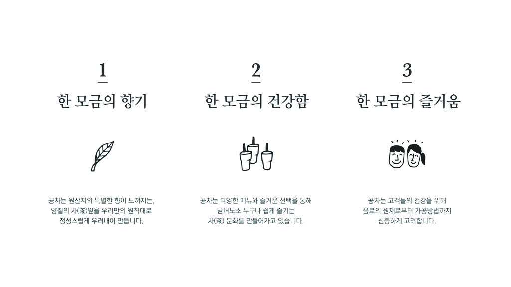 공차 브랜드 리뉴얼 프로젝트는 단지 이전에 감싸고 있던 겉모습을 바꾸는 데에 그치는 것이 아닌, 고객 입장에서 브랜드의 전체적인 모습을 하나의 이야기로 어우르기 위한 목표를 가진 프로젝트였습니다. 바뀐 모습의 공차가 고객들에게 새롭고 더욱 좋은 경험을 주기 위해 공차 구석구석에는 소소한 디테일이 숨어있습니다. 새로운 모습의 공차는 이제 우리 주변의 곳곳에서 우리도 모르는 사이에 ‘편안한 공간’으로서, ‘즐거운 브랜드’로서, 차(茶) 문화를 가장 친근하고 알리고 재미있게 들려주는 스토리텔러가 되어 있을 것입니다.