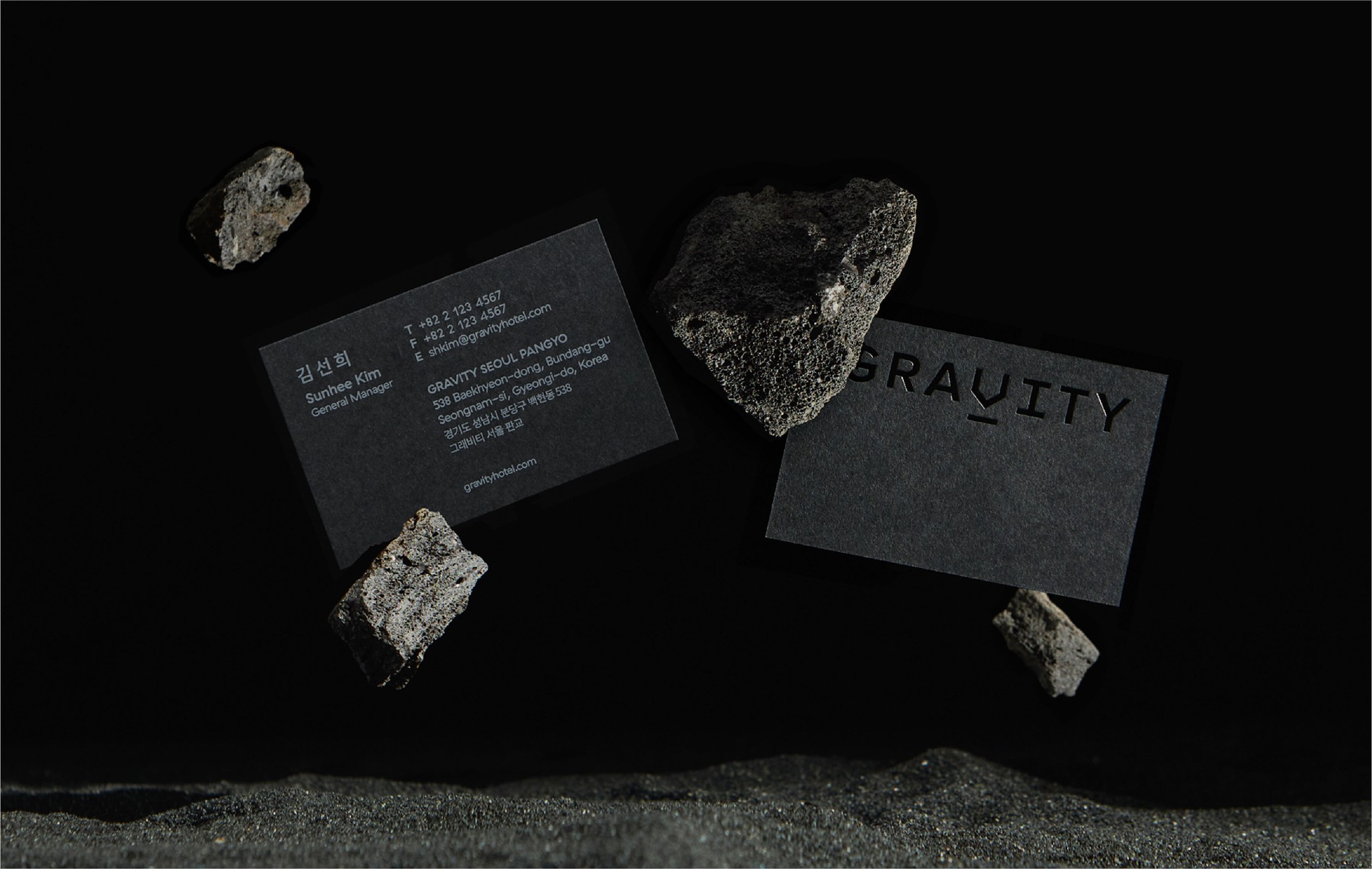 그래비티 서울 판교의 특유의 쉐브론 패턴으로 다양한 고객 접점 및 소재를 통해서 자연스럽게 브랜드를 노출하고 특유의 프리미엄 이미지를 연출합니다. 실제 우주의 행성에서 채취한 듯한 신비스러운 그래비티 블랙 컬러와 아이러니 그레이 컬러를 통해 보여지는 정제된 무드로 어지러운 일상에서 마치 무중력으로 해방되는 것 같은 놀라운 순간을 상징합니다.