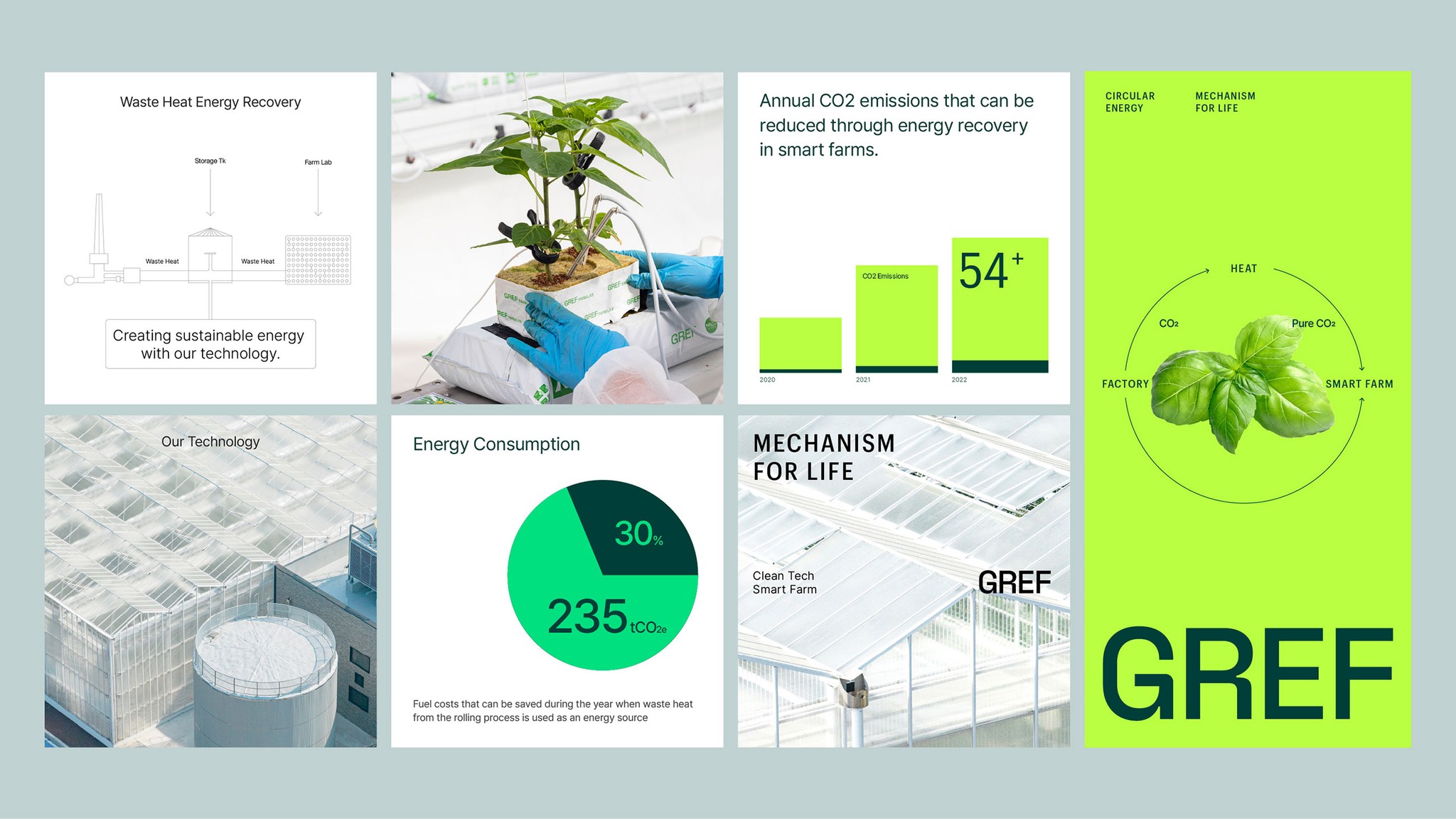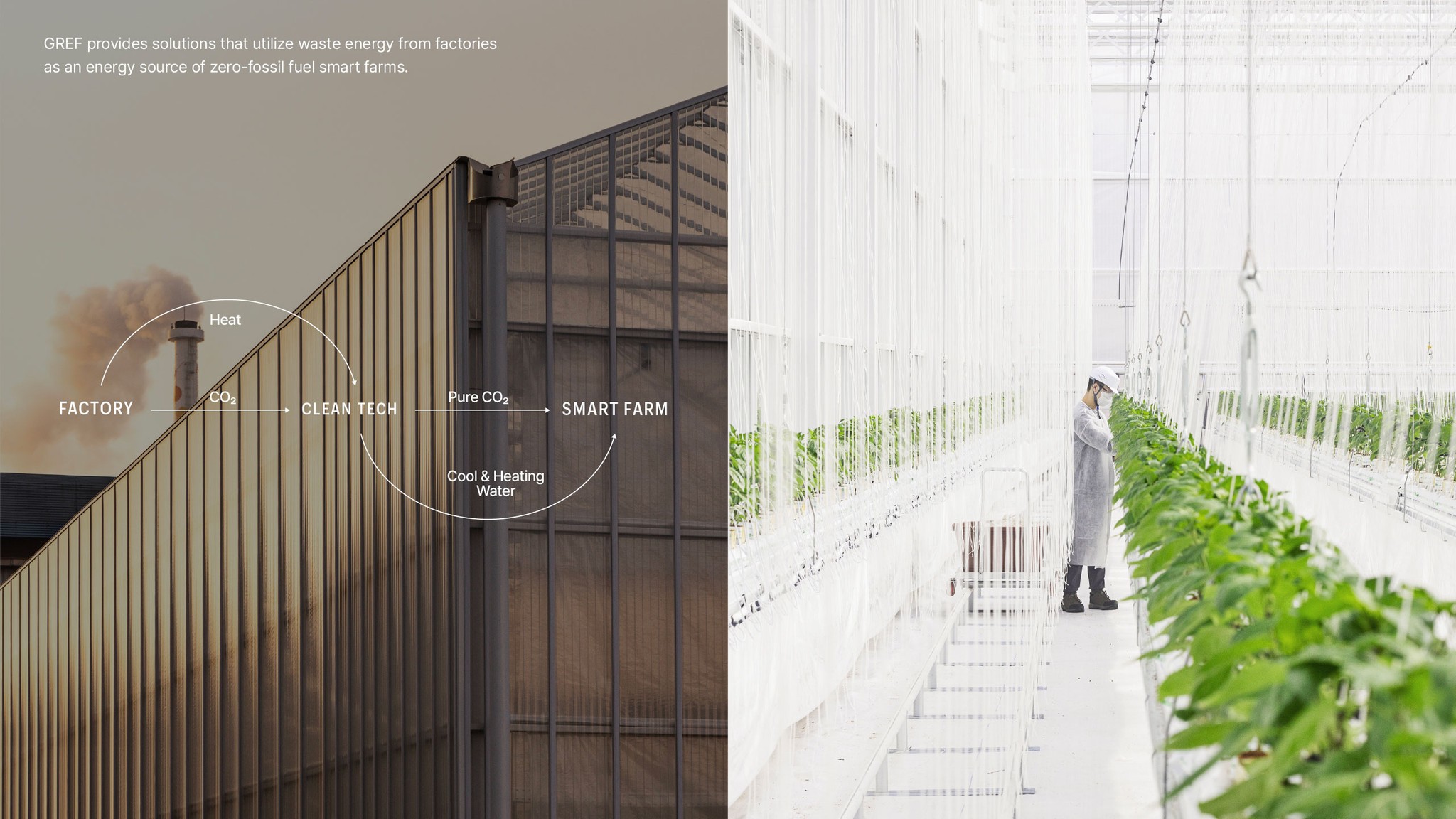 GREF는 대한제강에서 공장의 폐열을 첨단 기술력을 통하여 에너지원으로 활용하는 친환경 스마트팜입니다. GREF는 공장에서 나오는 미활용에너지를 재활용하여 화석연료 제로의 유리온실, 스마트 팜을 구축하고 좋은 품질의 먹거리를 생산하며 지속가능한 농산업의 발전을 도모하는 솔루션을 제공합니다. 공장 폐열을 주 에너지원으로 활용하여 자원의 순환을 만들고 생산의 메커니즘을 만들던 힘을 연결하여 생명의 메커니즘을 만드는 혁신을 만들어 갑니다. GREF는 자연의 푸르름을 계속해서 간직할 수 있도록, 철강을 생산하는 과정에서 공기중으로 버려지는 많은 양의 열과 에너지를 100% 활용해 온실에 필요한 성장 에너지로 바꾸는 솔루션을 찾아냈습니다.