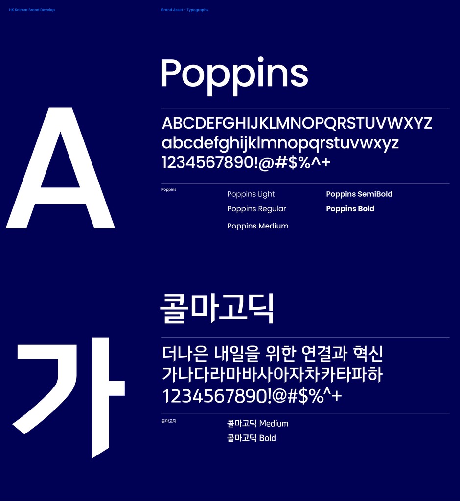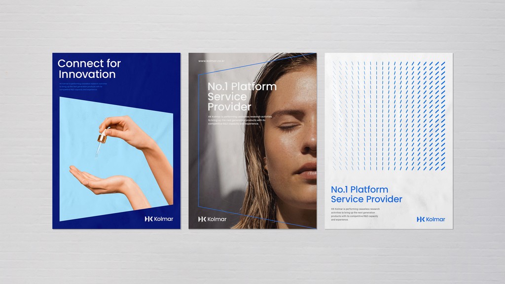 그래픽 모티프는 다양한 한국콜마의 심벌의 조형적인 특징인 사선으로 열리는 '문'의 형태를 이용하여 다양한 콘텐츠를 담아낼 수 있는 역동적인 형태의 모티프를 디자인했습니다. 역동적인 사선의 그래픽 시스템은 다양한 환경에서 유연하게 활용 할 수 있도록 고안되었으며 사선의 각도에서 영감을 받아 패턴으로 확장하여 활용 가능합니다. 단순히 고정된 패턴이 아닌 유동적인 패턴의 이미지를 주어 정체된 브랜드 이미지가 아닌 역동적이고 과학적인 분위기를 연출 하여 다양한 접점에서 활용 가능한 디자인입니다.