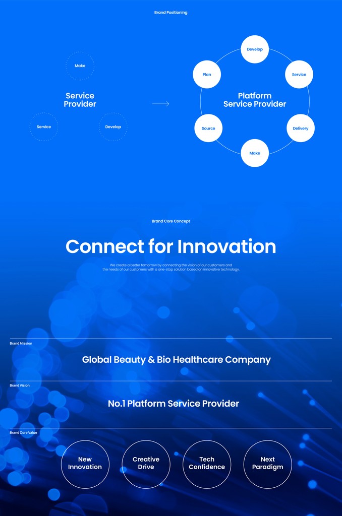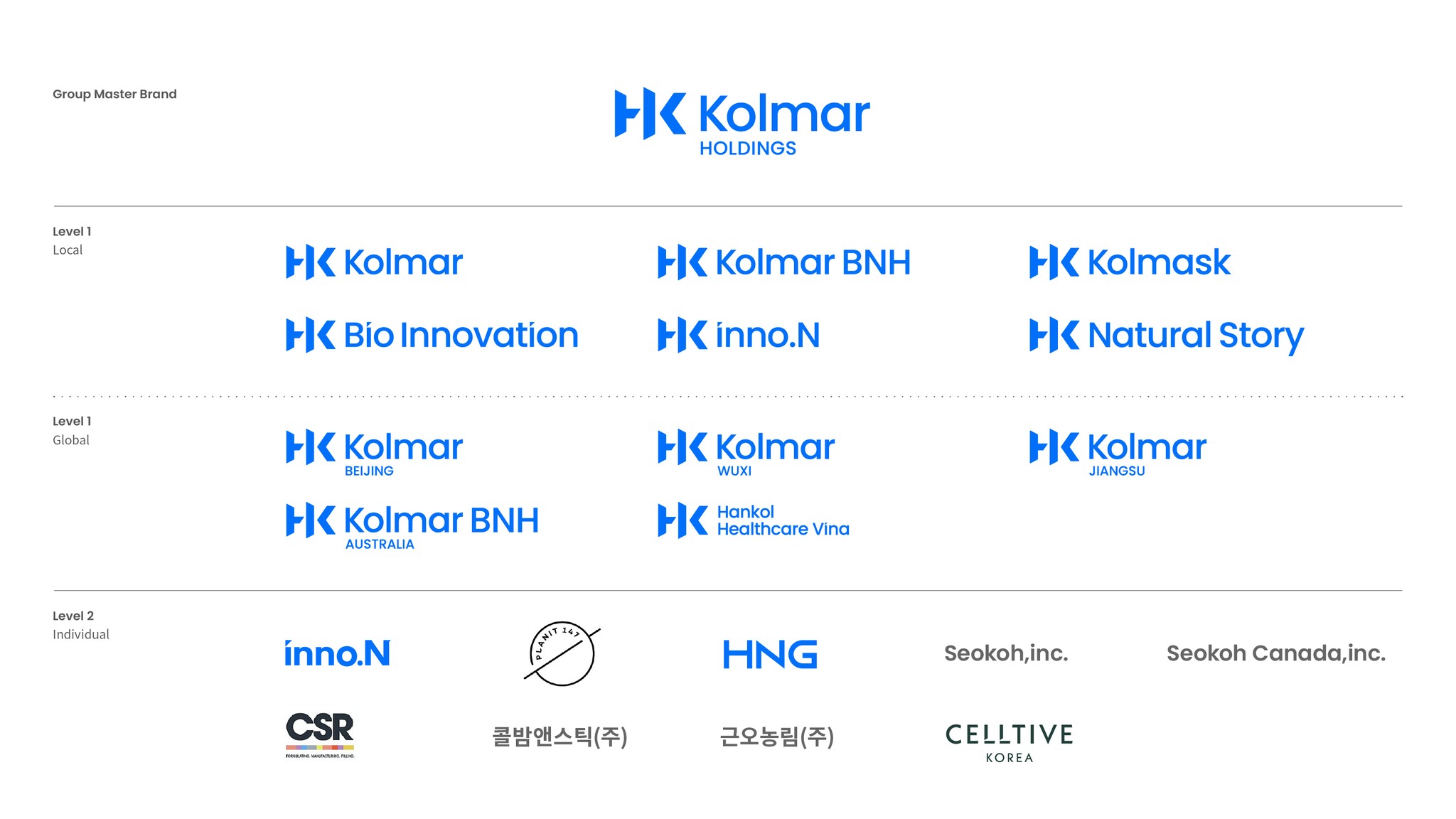 한국콜마의 계열사 구조는 지주사, 자회사, 손자회사 그리고 관계사로 구성되어 있는데 각기 다른 브랜드 로고를 사용하고 있었고 모호한 레벨과 브랜드 마크 사용으로 혼란스러운 브랜드 구조를 갖고 있었습니다. 이를 해결하기 위해 현 브랜드의 구조적 문제점과 동시에 그룹사들의 위계 시스템을 분석했고 앞으로 만들어질 다양한 계열사를 고려하여 하나의 강력한 마스터브랜드로서 체계적인 브랜드 위계 시스템을 구축하였습니다.