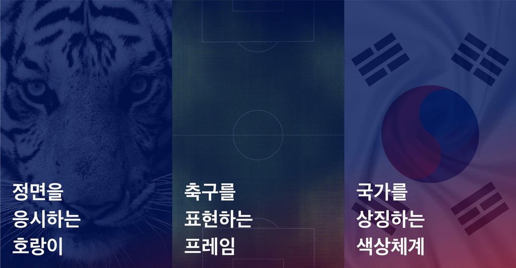 유럽 클럽 문화에서 쓰이는 전통적인 휘장은 제거하고 축구 경기장의 비율을 적용하여 경기장을 자유롭게 활용하고 지배하는 대한 축구를, 호랑이 얼굴의 6각 형태는 전술 대형으로 다양한 전략 축구를 구사하는 우리 대표팀을 상징합니다. 호랑이의 얼룩무늬를 단순화한 패턴은 골문을 향한 상승과 전진을 표현하였습니다.