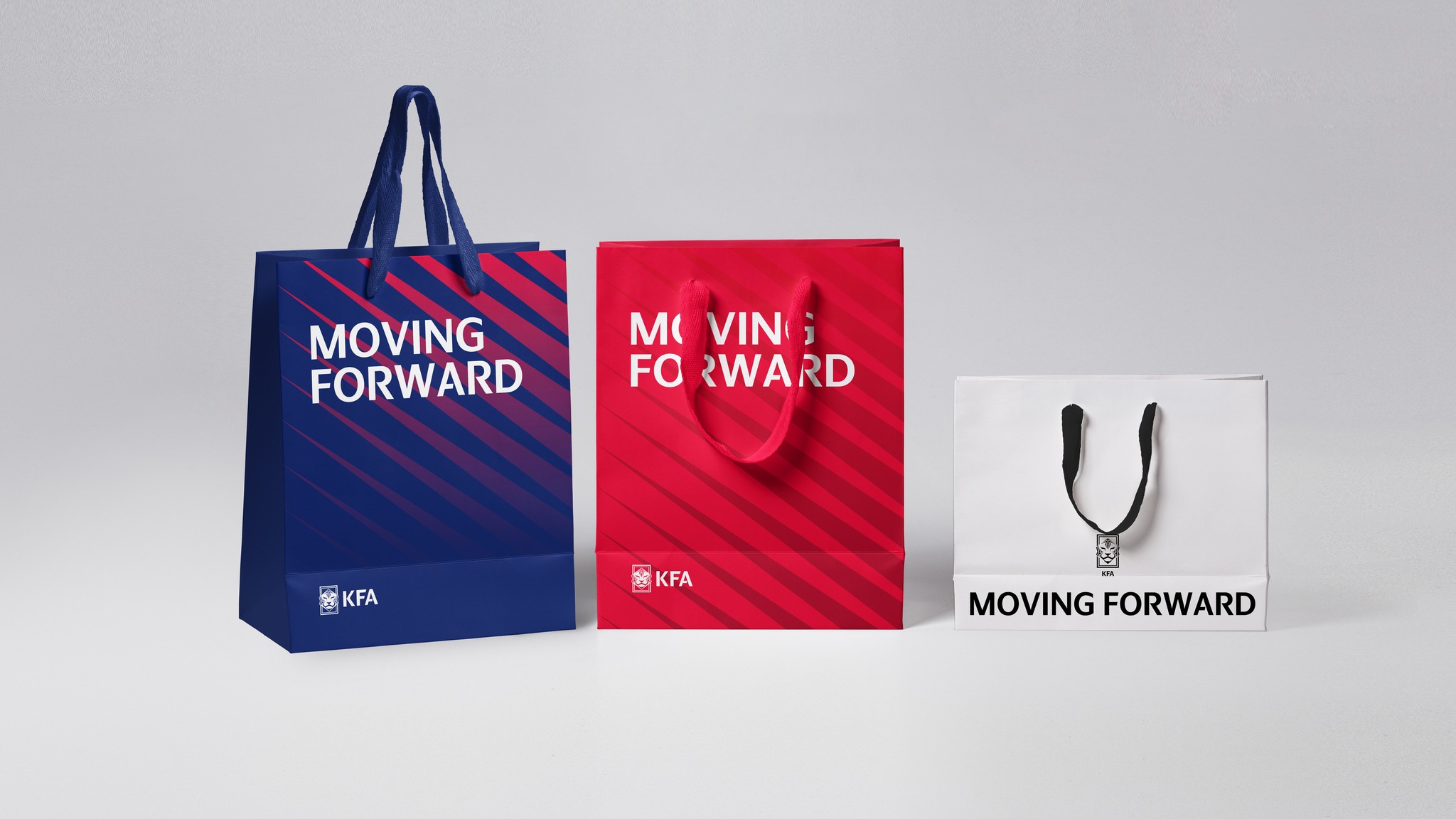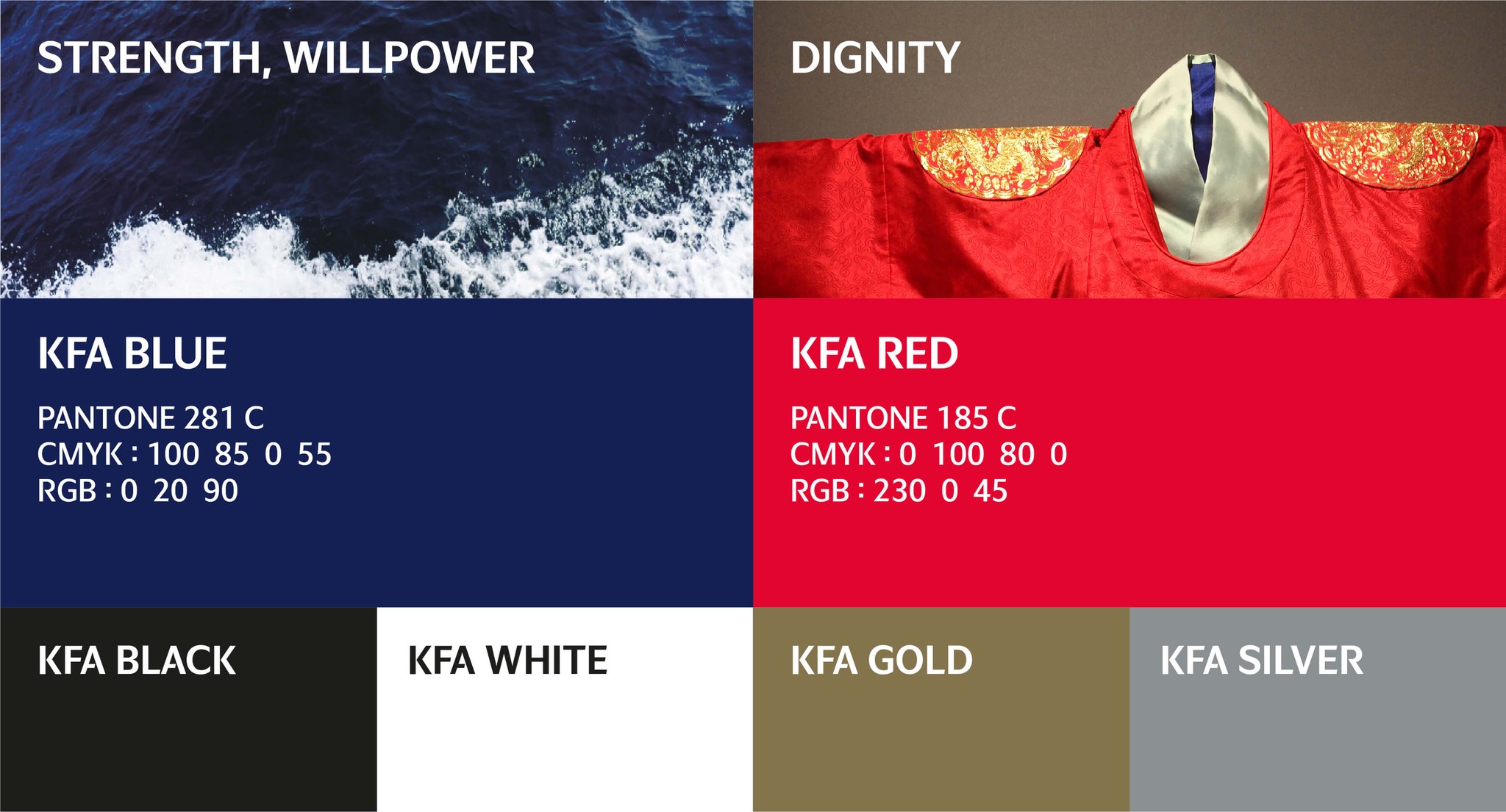 컬러는 태극기에 들어간 레드, 블루, 블랙, 화이트를 주요 색상으로 사용하되 전통에서 차용되었지만 현대미를 더하여 새롭게 재해석하였습니다. 우리 선조의 임금이 입었던 붉은 곤룡포의 레드컬러는 용맹함을, 동해의 푸른바다를 담은 블루컬러는 위엄과 역동을 상징합니다.