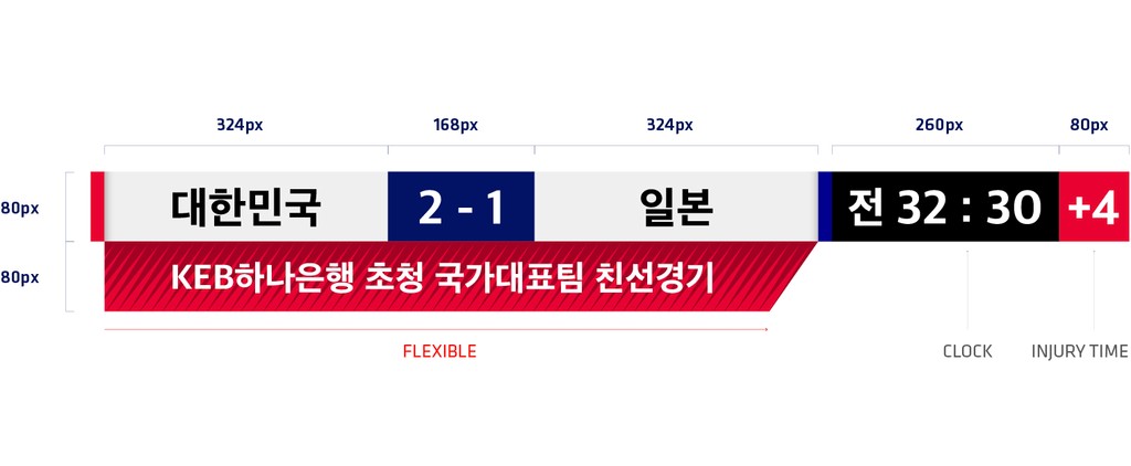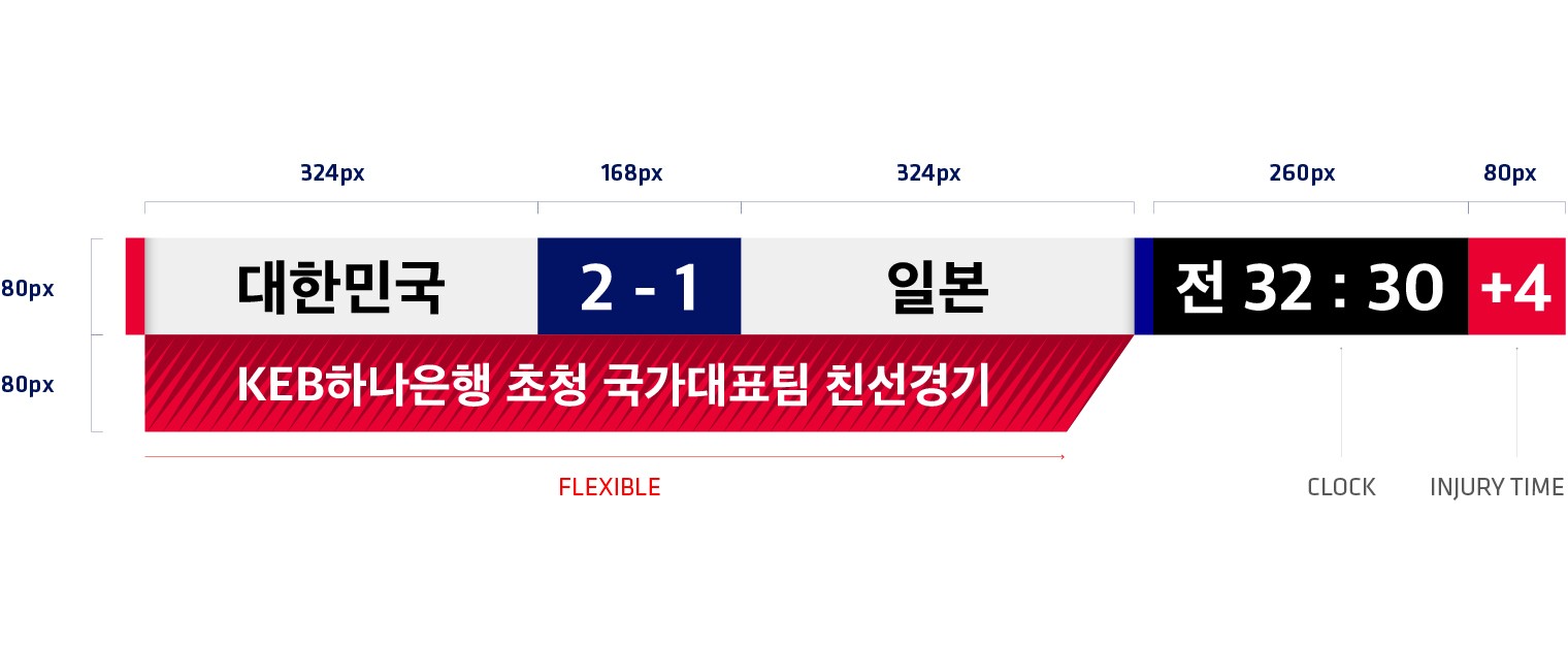 전용서체는 새롭게 개발된 엠블럼의 조형적 특징을 강조하여 엠블럼의 비율, 질감, 형태를 반영하였습니다. 가로획의 맺음을 우측으로 전진하도록 시각적으로 돋보이게 하고 상대적으로 좁은 글자너비로 경기장과 비슷한 시각적 유사성과 날렵한 이미지를 더하였습니다.