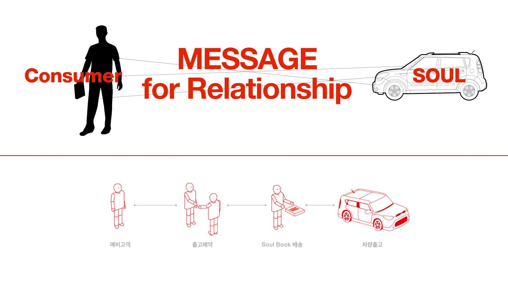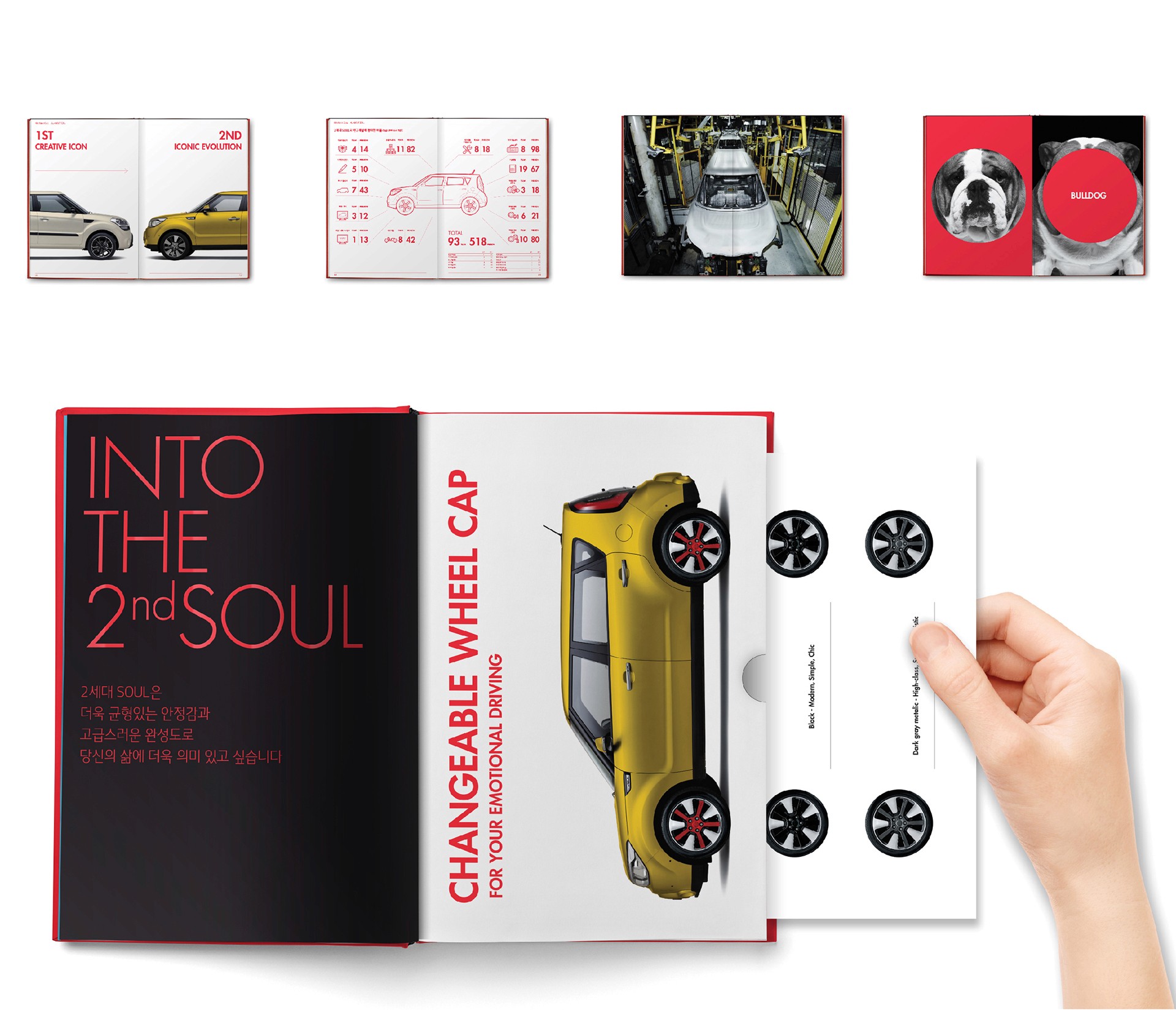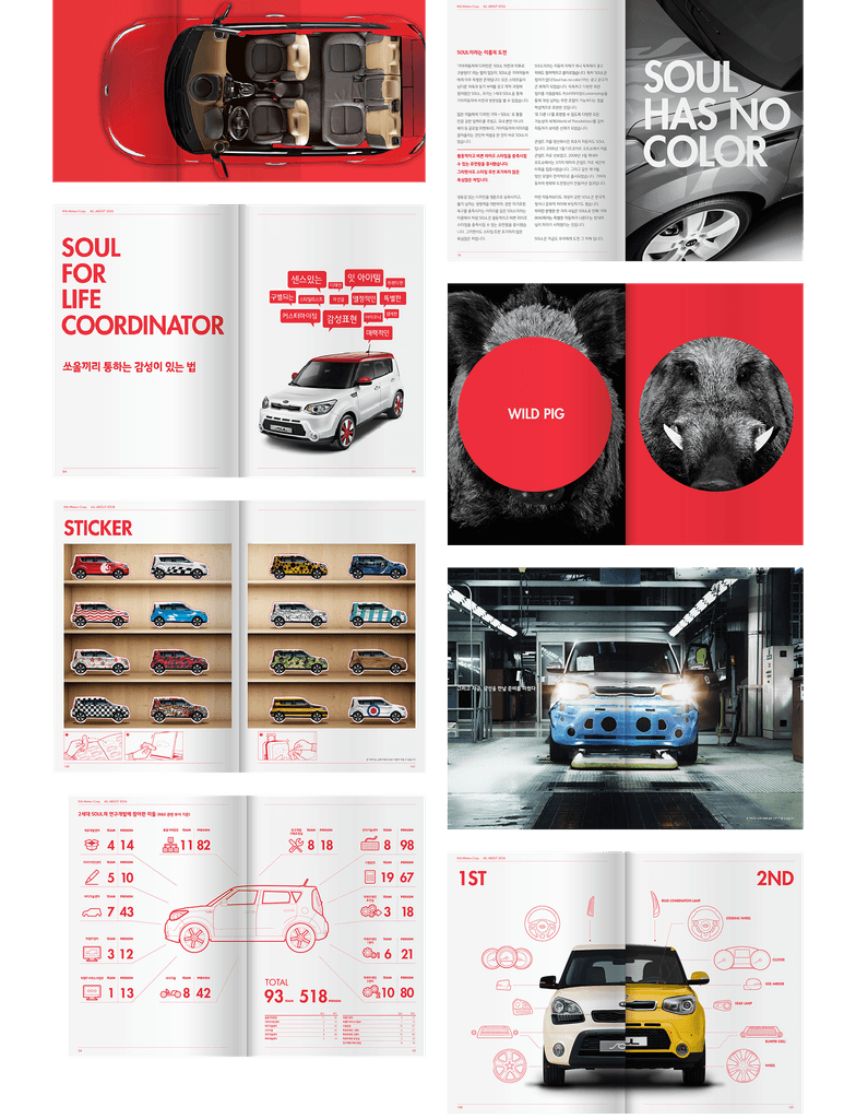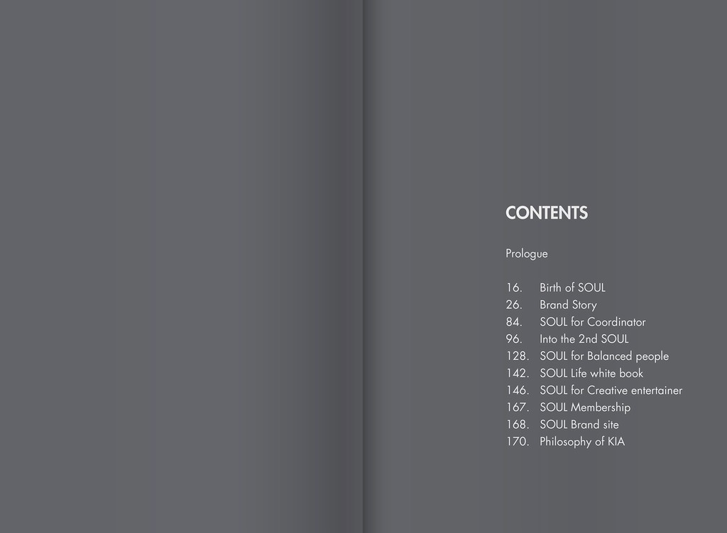 좋은 브랜드는 쉽게 전달됩니다. Soul의 이야기를 더욱 쉽게 전달하기 위해 우리가 선택한 방법은 브랜드 북을 만드는 것이었죠. Soul에 대해 알아가면서 느낀 것은, 소비자의 궁금함보다 훨씬 더 많은 이야기들이 하나의 브랜드에 녹아있다는 사실이었습니다. Soul이 가진 흥미로운 이야기들을 소비자에게 브랜드 아이덴티티로 전달함으로써 브랜드와 소비자 사이의 빈 여백을 채울 수 있을거라 생각했습니다. 그리고, 대부분의 소비자들이 나의 자동차가 어떻게 만들어지고 어떤 노력이 담겨있는지 쉽게 알지 못한다는 점에서 우리는 이런 이야기들을 담는 하나의 스토리북을 만들기 시작했습니다.