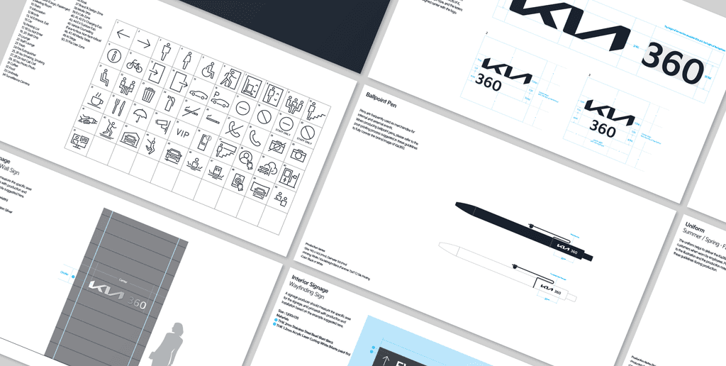 Kia360에는 EV Life Zone, Counseling, Connected House 등 오직 Kia360에서 체험할 수 있는 모빌리티 라이프 경험 요소가 다양하게 준비되어 있었고, 우리는 방문객이 이를 보다 쉽게 인지할 수 있도록 기아 로고의 디자인적 특징을 적용하여 일관된 조형의 시각언어와 커뮤니케이션을 위한 픽토그램을 개발하였습니다.