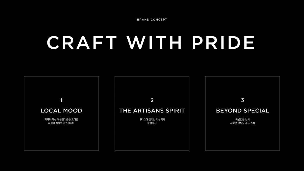 차별화 포인트를 기반으로 품질과 타협하지 않으며, 완벽한 한잔을 만들어내는 커피에 대한 자부심을 브랜드 컨셉으로 설정하고 이에 따른 퍼스널리티를 ‘Local mood’, ‘The artisans Sprit’, ‘Beyond sepcial’로 정의했습니다. 이런 브랜드 퍼스널리티를 좀더 명확하게 이해하기 위해 브랜드 톤앤 무드를 만들고 디자인을 진행했습니다.