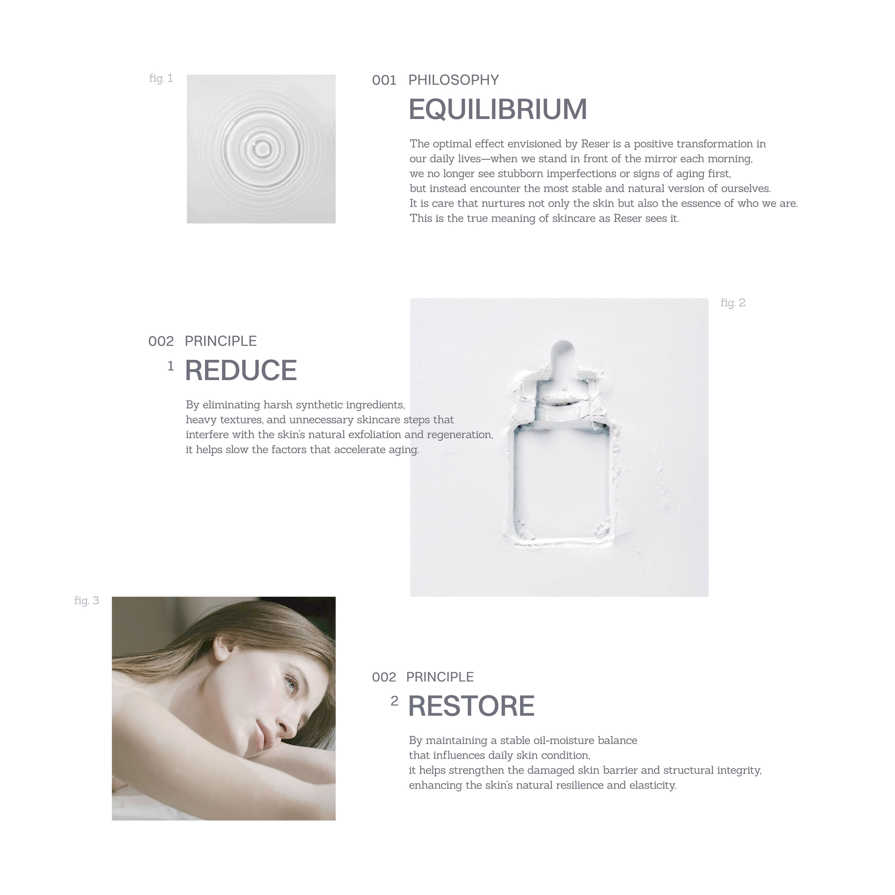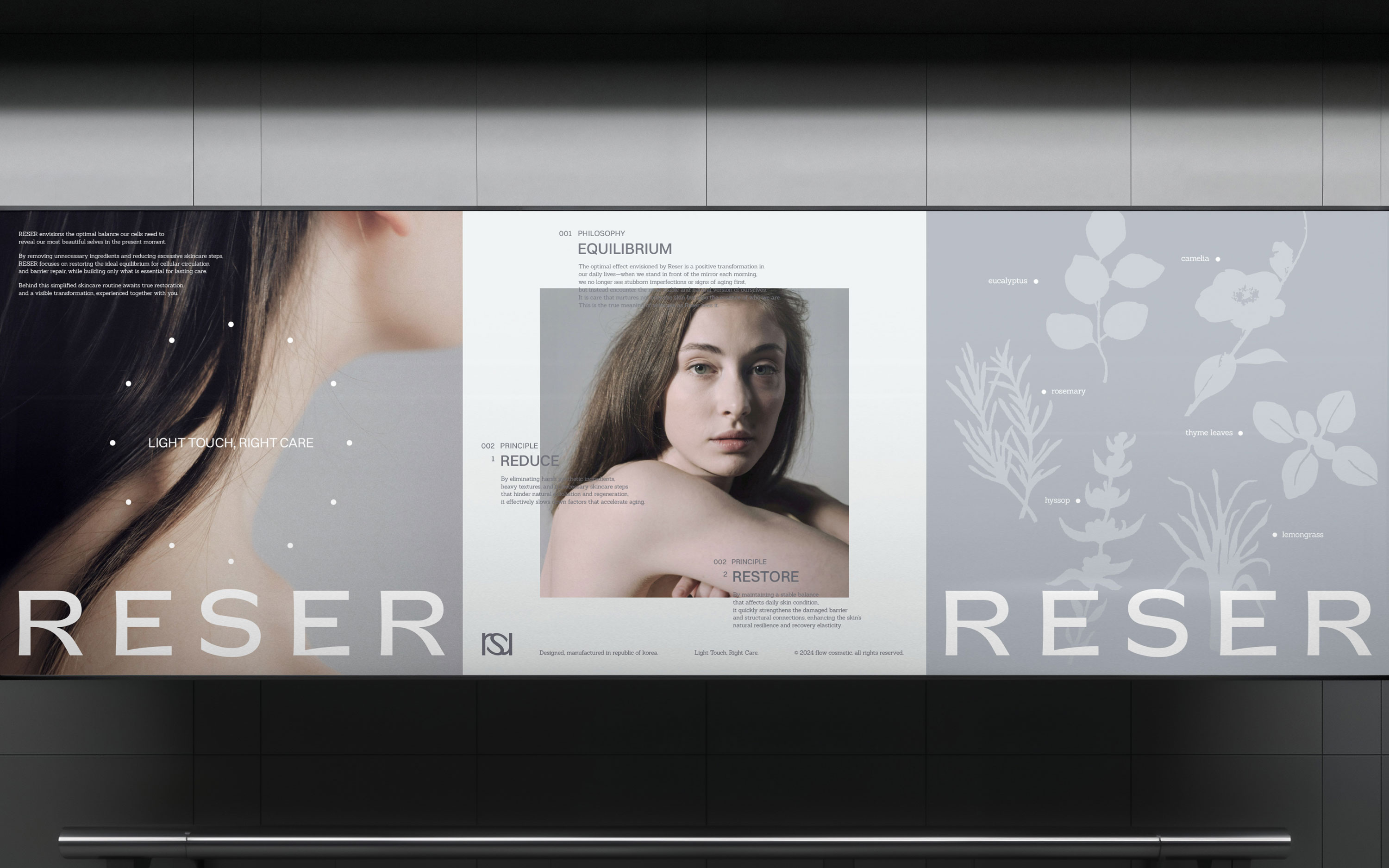 우리는 종종 가장 아름다웠다고 여겨지는 과거의 모습을 떠올리며 그 시절의 모습으로 돌아가기를 기대합니다. 하지만 그 어떤 제품도 피부의 시간을 되돌리기는 어렵습니다. 우리의 피부에 정말 필요한 것은 무엇일까요? 르세르는 지금의 피부가 지녀야 할 가장 건강한 균형점에 집중합니다. 르세르가 제안하는 모든 제품은 피부 스스로 가장 안정적인 평형 상태를 회복하고 유지할 수 있도록 돕는 이퀄라이징 시스템(Equalizing System)을 기반으로 합니다. 유분과 수분의 균형, 탈각과 재생의 순환, 그리고 당화와 산화와 같은 피부의 다양한 기전을 섬세하게 케어하여 피부 본연의 건강한 컨디션을 유지하도록 설계되었습니다. 르세르는 스킨케어 단계가 늘어날수록 외부 물질과 합성 성분이 피부에 더해질 가능성에 주목했습니다. 과도한 스킨케어 단계를 덜어내고, 간결한 터치로 피부 본연의 균형을 섬세하게 쌓아가는 방식을 지향합니다. 무거움에서 가벼움으로, 복잡함에서 간결함으로. — 르세르는 과거의 나로 돌아가기 위한 소모적인 안티에이징이 아닌, 오늘의 나를 지속하기 위한 건강한 슬로우 에이징을 제안합니다. 르세르가 만들어내는 이상적인 변화는 매일 아침 우리가 거울 앞에서 스스로를 마주할 때, 쉽게 회복되지 않는 결점이나 노화 징후를 먼저 보는 것이 아닌 가장 안정적이고 자연스러운 상태의 ‘나’를 마주하게 되는 기분 좋은 일상으로의 변화입니다. 르세르의 브랜드 철학은 시각 체계 전반에도 반영되었습니다. 복잡한 스킨케어 단계를 덜어내는 과정을 표현한 워드마크와 피부의 올바른 균형과 지속 가능한 순환을 시각화한 비주얼 시스템을 통해 르세르가 지향하는 슬로우 에이징과 균형의 가치를 전달할 수 있도록 설계했습니다.