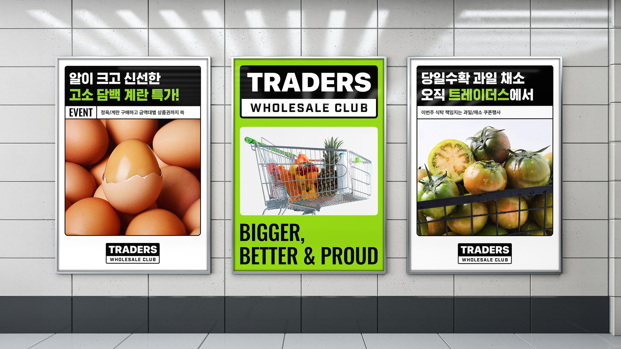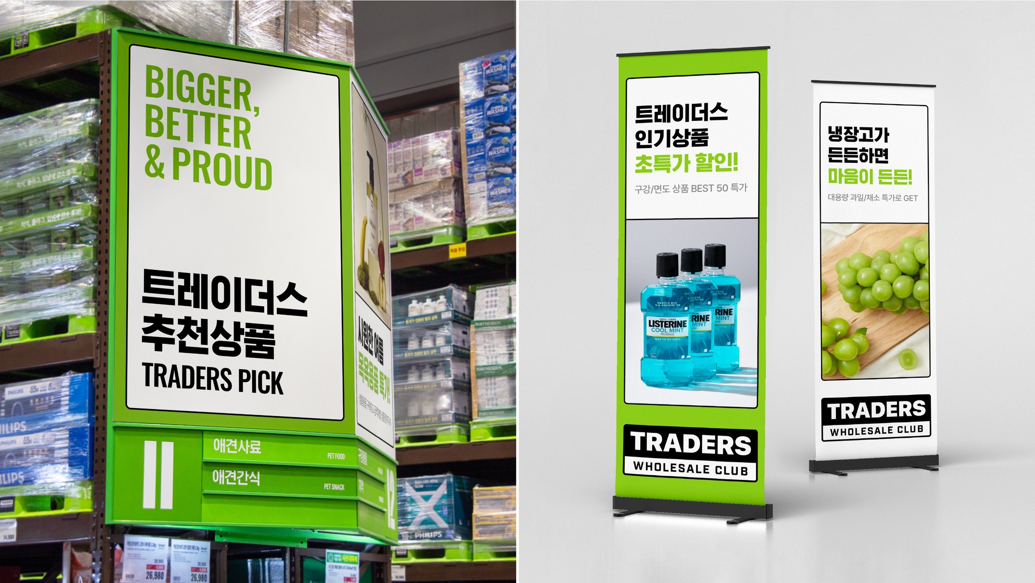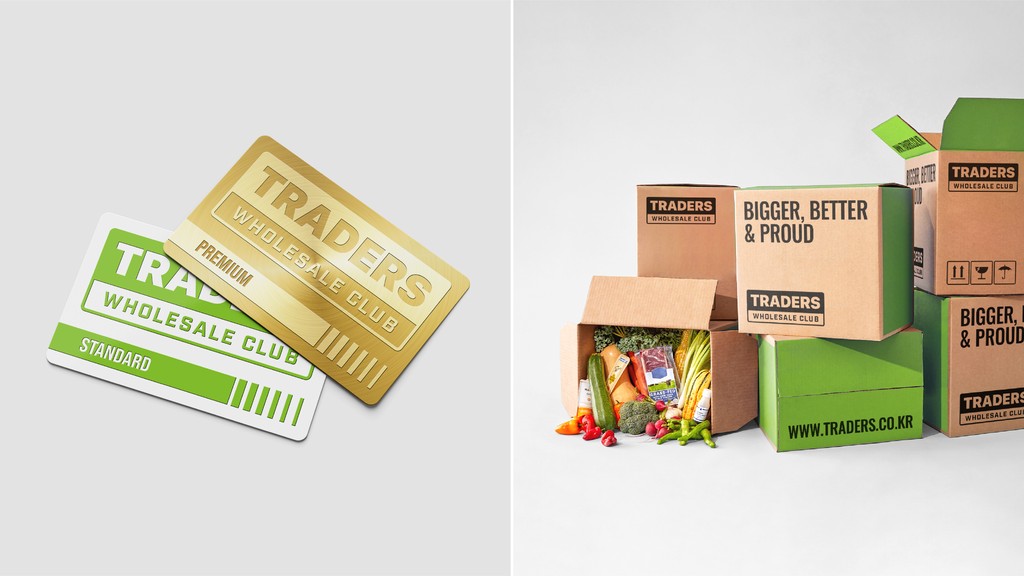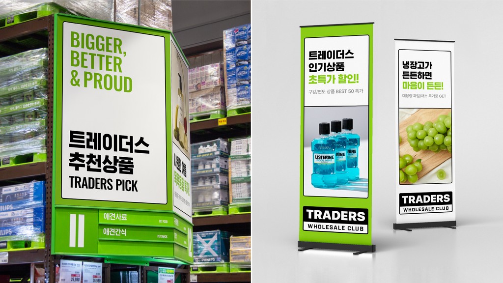 기존의 이마트와 다른 독자적인 아이덴티티를 가진 '이마트 트레이더스'는 창고형 할인점 본연의 정체성을 강화하고, 미래 성장 동력을 모색하고자, '트레이더스 홀세일 클럽'으로 브랜드명을 변경하고, 비주얼 아이덴티티 시스템을 전면 개편하였습니다. 창고형 할인점이라는 업의 본질에 근거하여 새로운 가치를 '압도적인'과 '독점적인'으로 설정하고, 이에 따라 보증을 상징하는 Label 형태의 브랜드 로고로 트레이더스의 '믿을 수 있는 상품'과 '독점적인 혜택'을 시각화했습니다. 새로운 브랜드 컬러와 타이포그래피는 시인성과 가독성을 개선하면서도 트레이더스의 정체성을 유지하여, 기존 브랜드 자산을 연계합니다. 로고의 특징을 활용한 그래픽 시스템은 다양한 제품 정보가 소비자에게 명확하게 전달될 수 있도록 돕습니다.