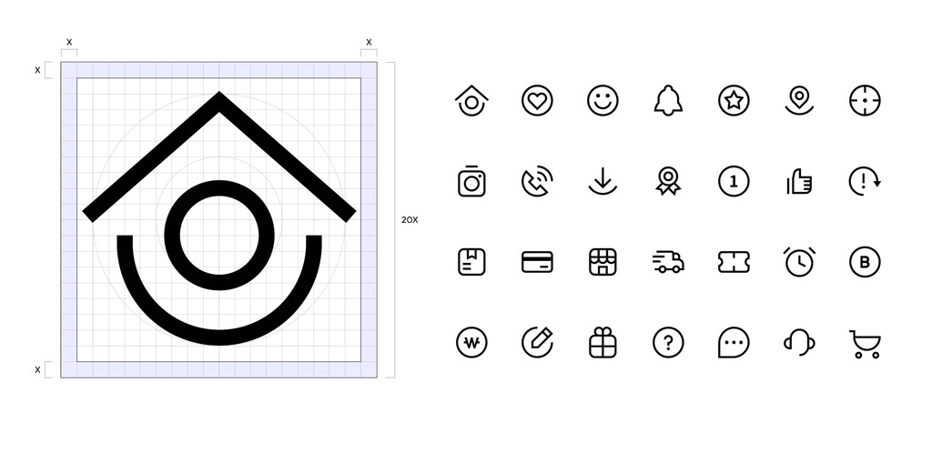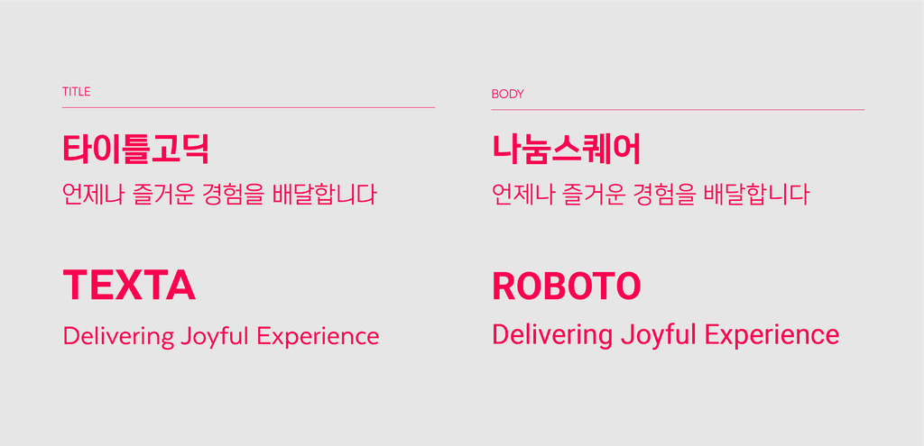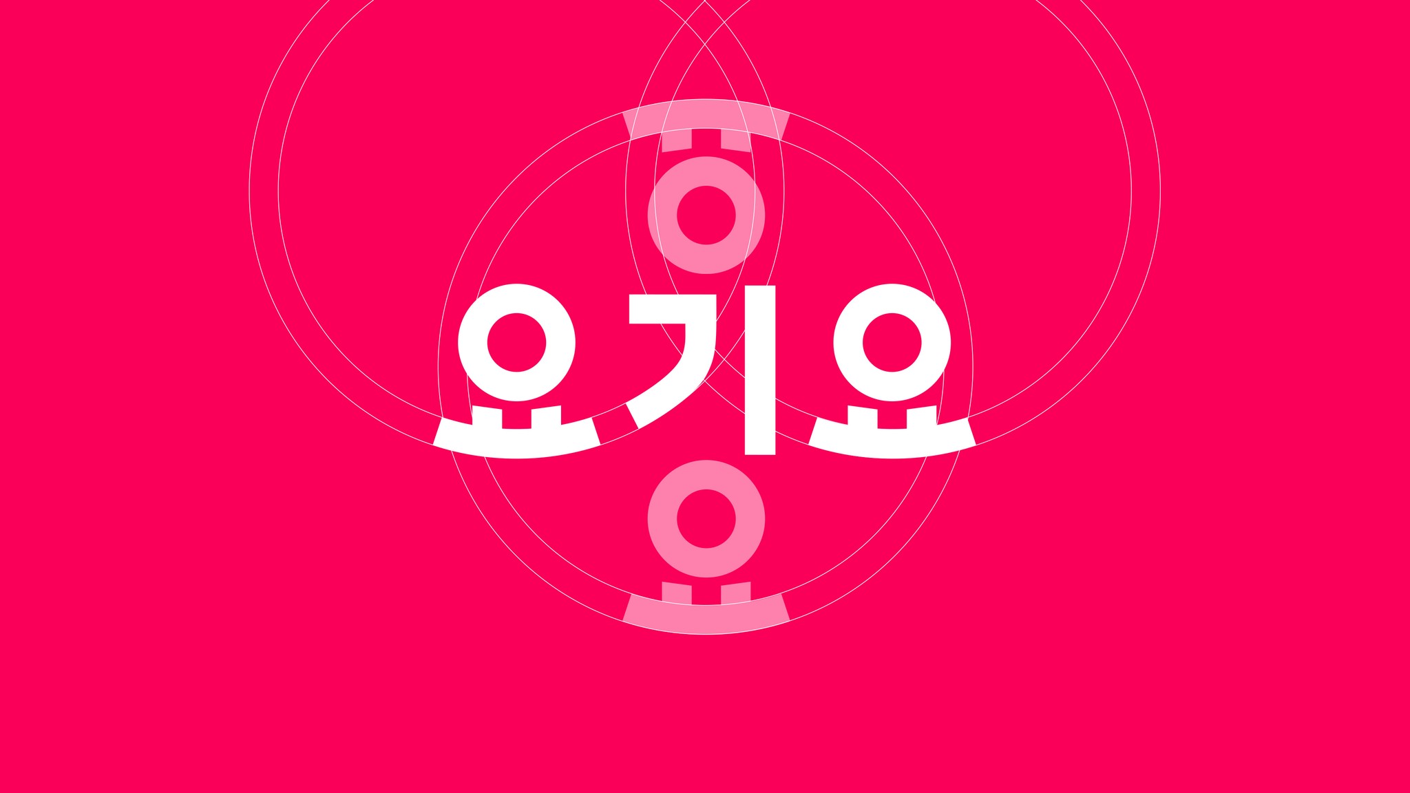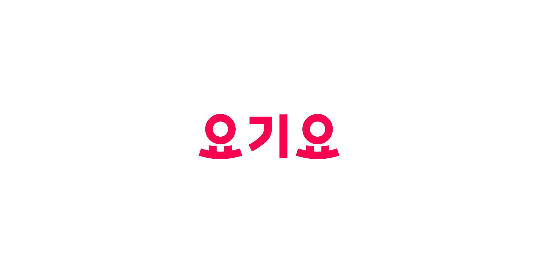 요기요의 로고는 깔끔한 산세리프 서체를 바탕으로 원의 도형을 바탕으로 요기요의 즐거움을 나타낼 수 있는 곡선을 주로 사용하여 요기요만의 독특하고 즐거운 정체성을 보여줍니다. 영문이 아닌 국문을 기본으로 커뮤니케이션하며 브랜드 슬로건과 결합하여 사용합니다.