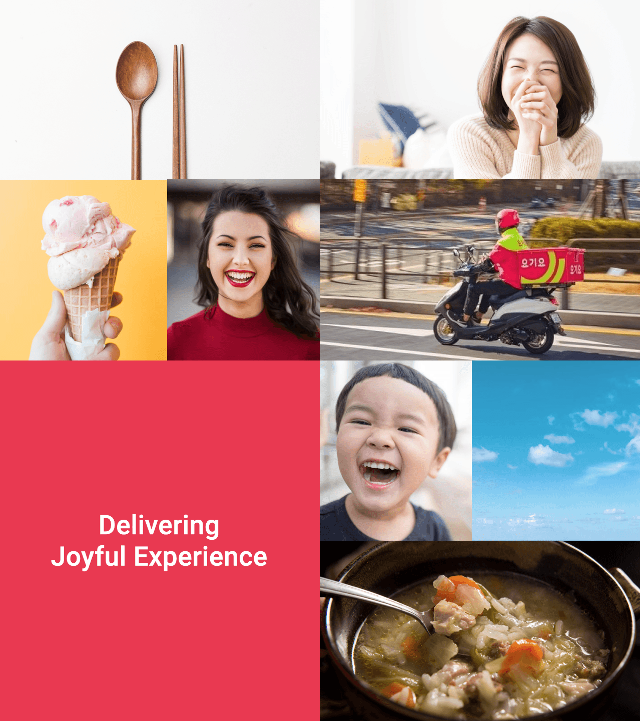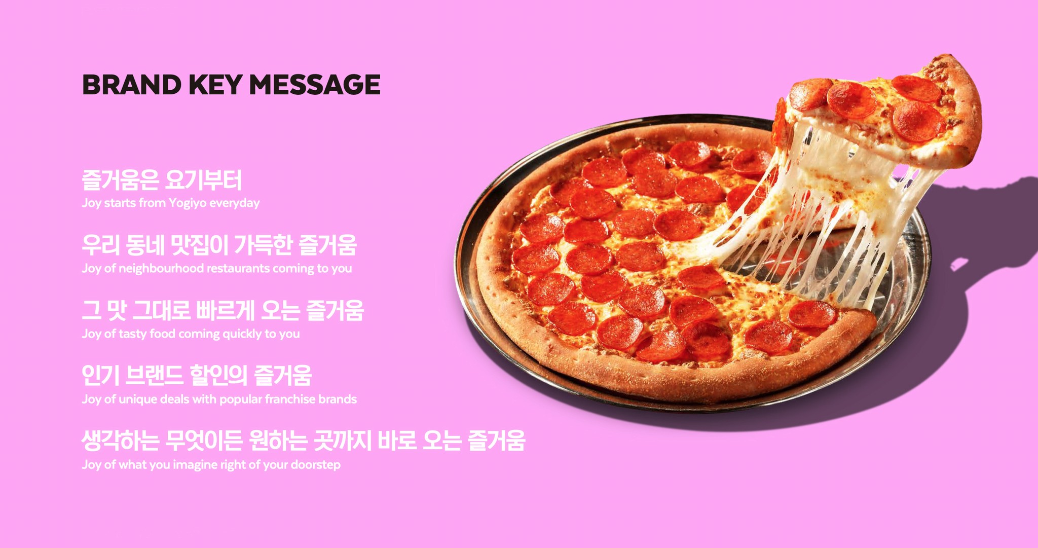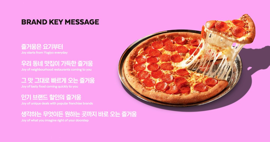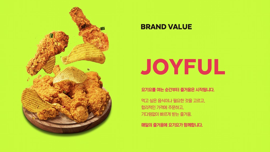 고된 하루를 위로하는 치맥, 수고한 가족을 위해 준비한 정성스러운 한끼. 음식은 우리의 하루를 완성하는 중요한 의식이고 생활입니다. 요기요는 모든 일상에서 단순히 음식 배달 이상의 즐거운 경험을 만들어 가려고 합니다. 치킨의 바삭함이 식지않게, 근사한 저녁과 준비한 정성이 온전히 전해지는 것은 물론이고 요기요를 이용하는 그 순간부터 즐거움이 느껴지는 다이나믹한 브랜드를 지향합니다.