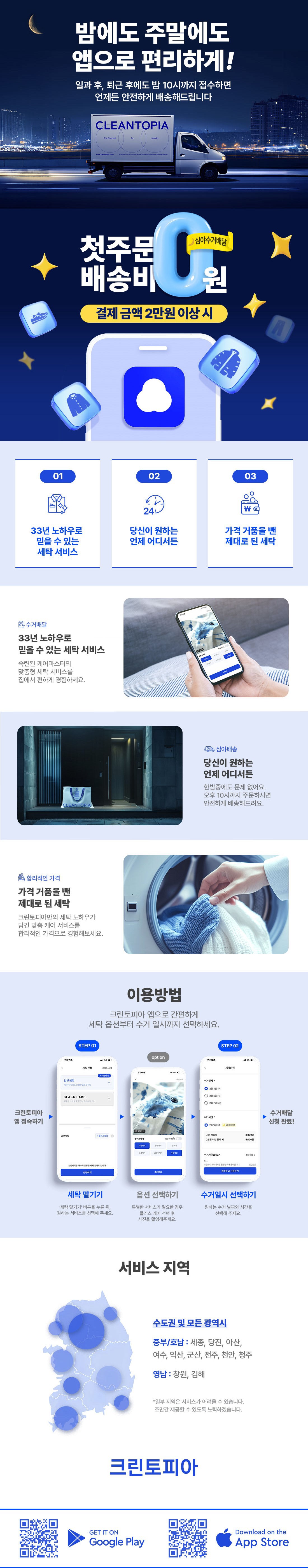배달 중심의 세탁 서비스는 따라할 수 없는, 크린토피아만의 '품질'을 직관적인 메시지로 강조하였습니다.