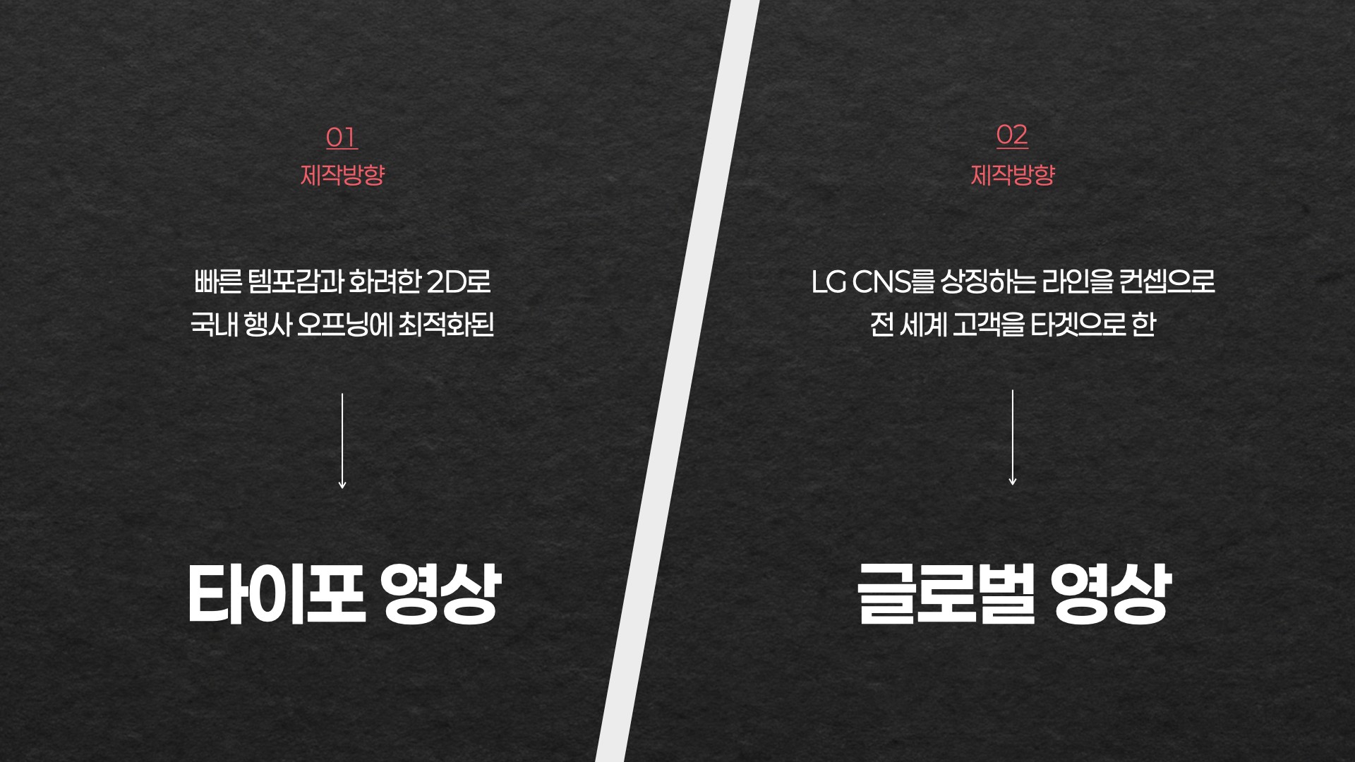 모두가 본인들의 ‘혁신’만을 강조할 때, 오직 ‘고객의 혁신’만을 바라보는 기업이 있습니다. No.1 AX 솔루션 기업 LG CNS의 이야기죠. 이같은 철학을 뒷받침하듯 비전 또한 명확합니다. ‘Innovator for Innovator’ 즉, 혁신가를 위한 혁신가로서 고객의 비즈니스 성장을 이루겠단 의미죠. LG CNS가 추구하는 철학과 비전, 이 두 가지 이야기를 담기 위해 두 가지 버전의 영상을 기획하였습니다.