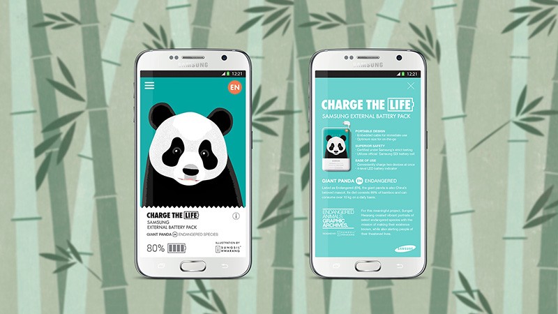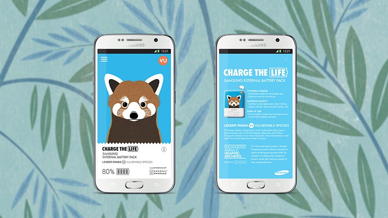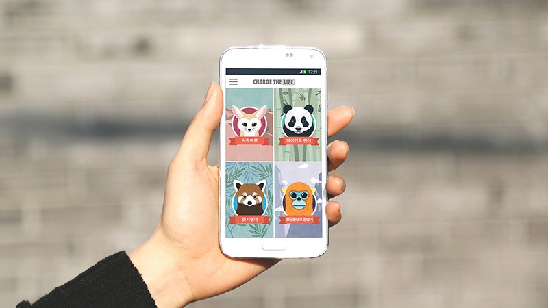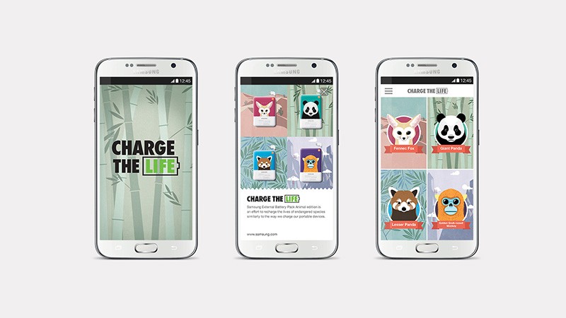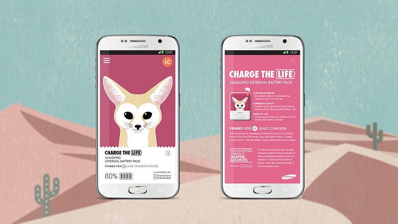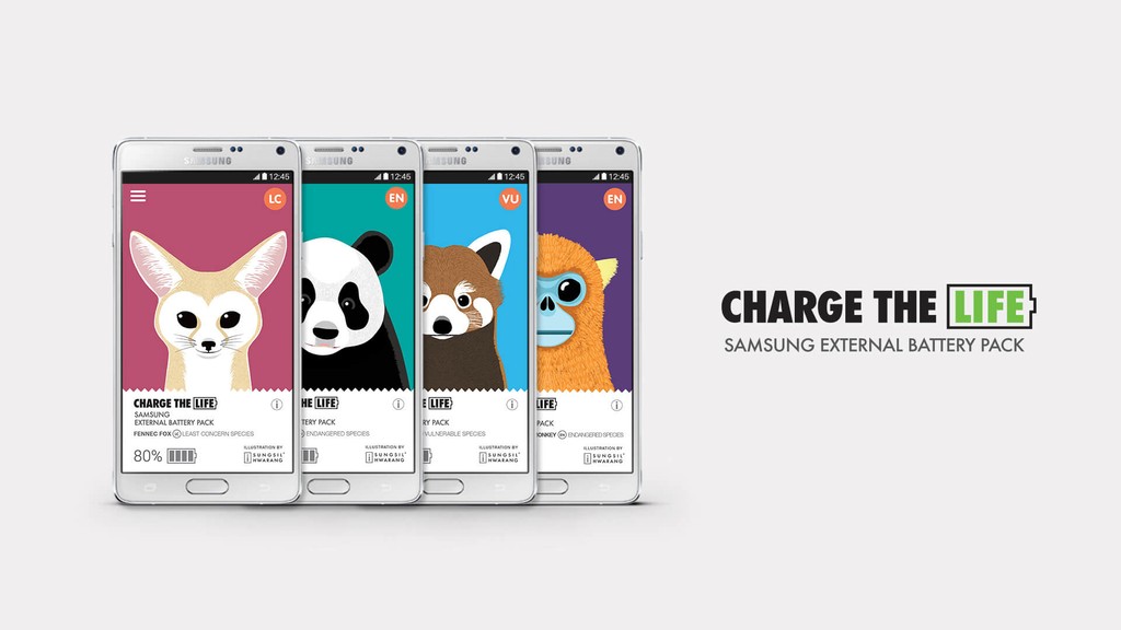 멸종위기 동물에 대해 얼마나 알고 계신가요? 가까운 미래에는 동물원에서 조차 볼 수 없을지 모를 수많은 멸종위기의 동물들. 삼성 배터리팩 동물 에디션 ‘Charge the Life’는 배터리팩으로 모바일기기를 충전하듯 사라져가는 동물들의 생명도 다시 살리자는 의미를 갖습니다. 모바일 디바이스가 충전됨에 따라 ‘Charge the Life’ 멸종위기 동물들의 움직임이 점차 활기차고 생기있게 변해가는 모습을 직접 체험해 볼 수 있고 멸종위기 동물을 선택 후 동물의 얼굴을 터치하면 귀여운 소리와 함께 화면 속 동물이 반응하여 사람들에게 인간과 함께 살아가는 이 세상의 많이 동물들이 존재하고 있음을 그리고 사라져가고 있음을 각인시키는 캠페인 입니다.