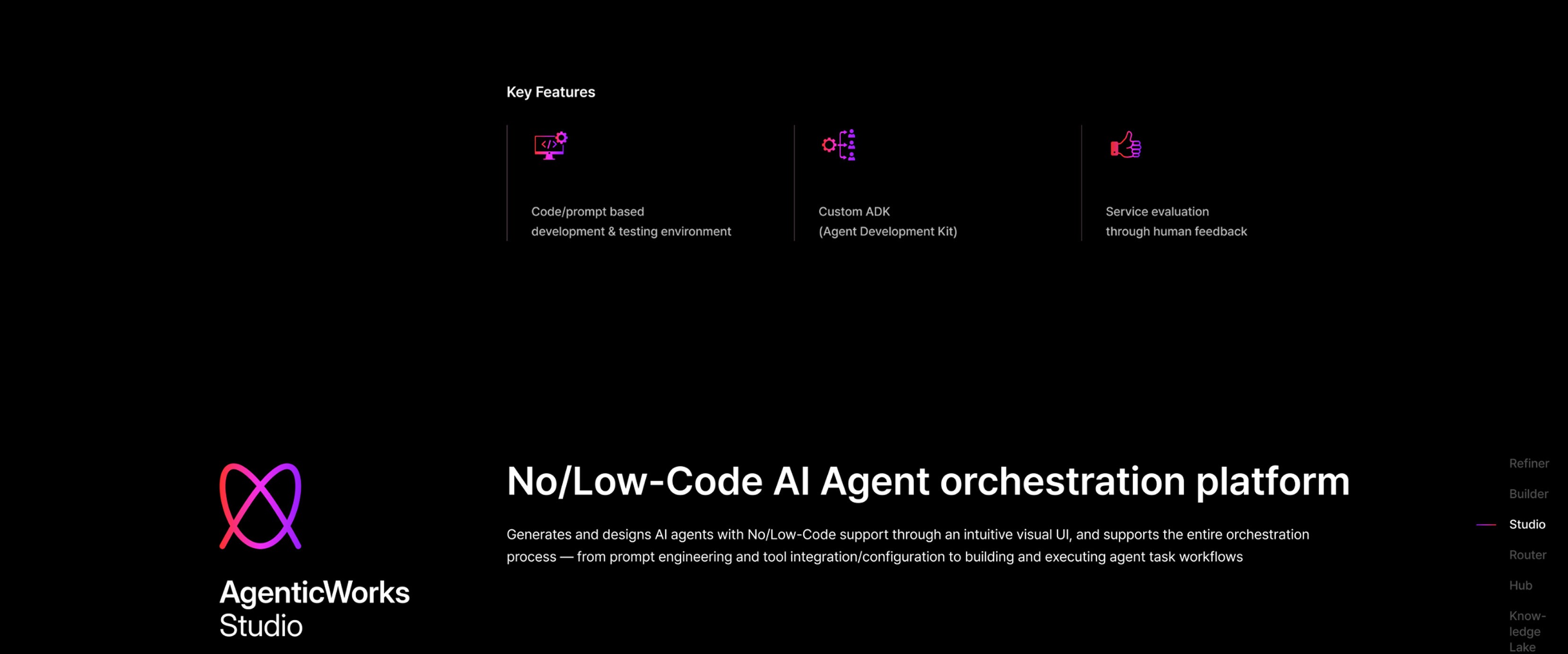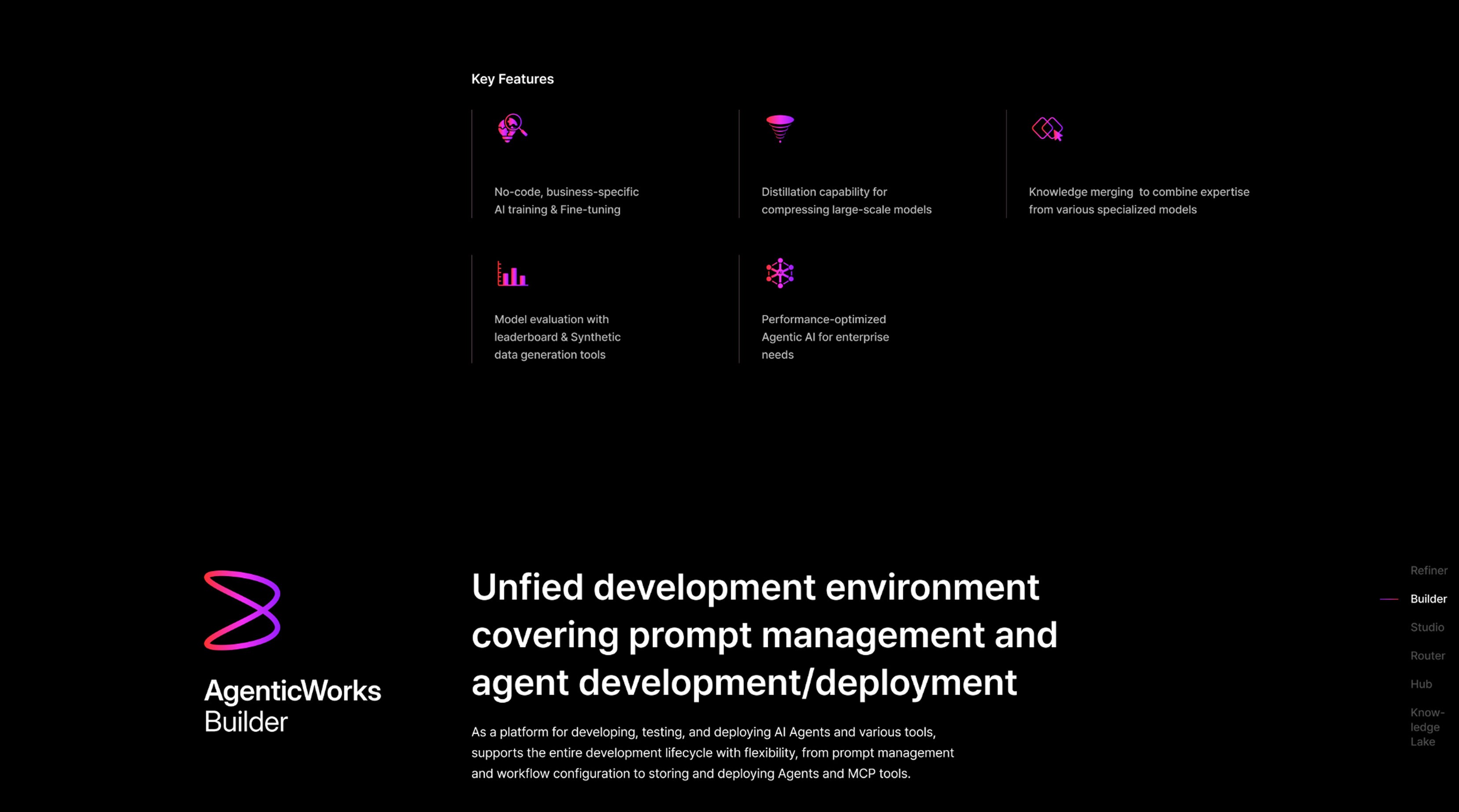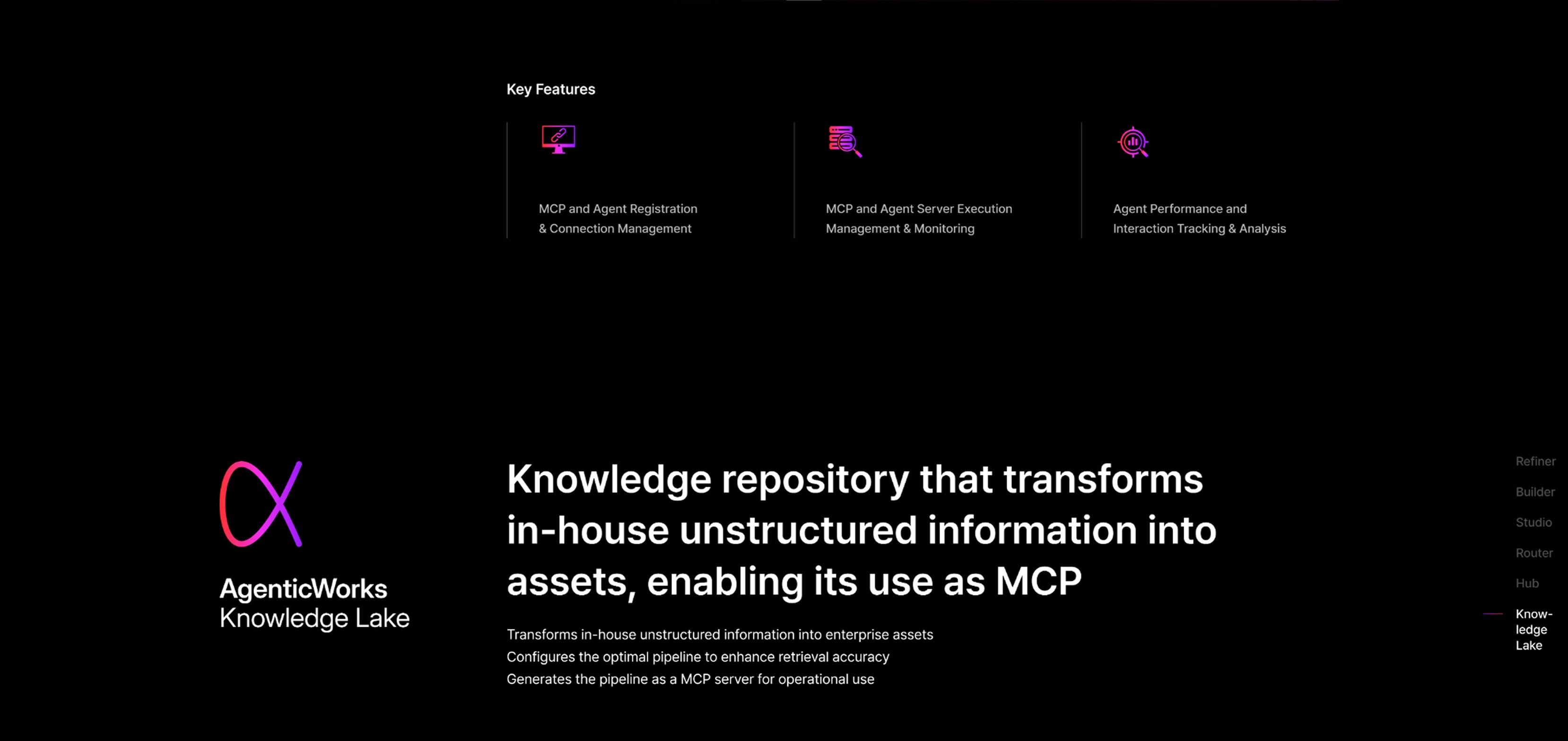UX/UI 측면에서는 각 모듈의 성격이 분명하게 드러나면서도 전체적으로는 하나의 통합된 플랫폼으로 인식될 수 있도록 설계했습니다. AgenticWorks 플랫폼을 구성하는 6개의 핵심 모듈을 소개하고, 각 모듈이 Agentic AI 구축과 운영 과정에서 어떤 역할을 하는지 한눈에 이해할 수 있도록 시각화했습니다.