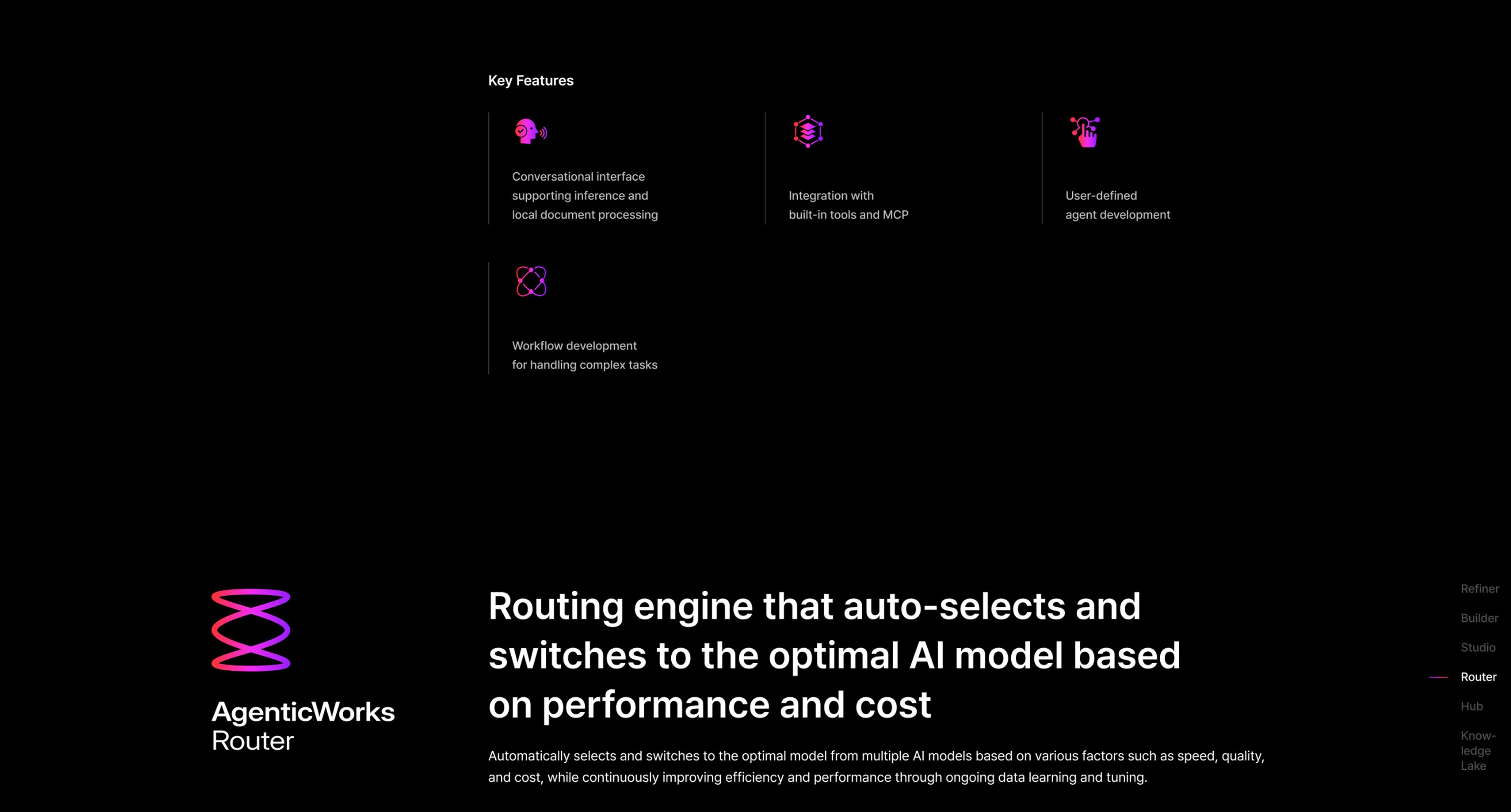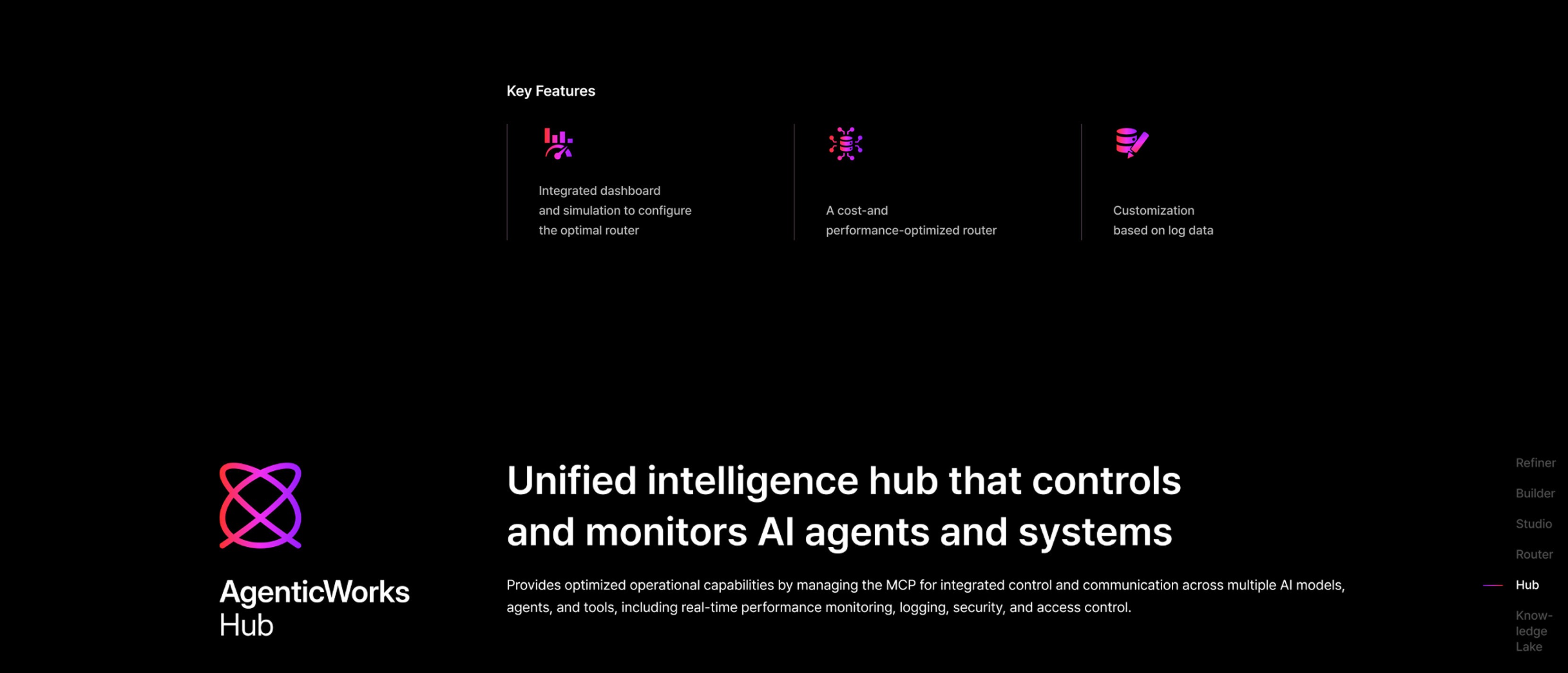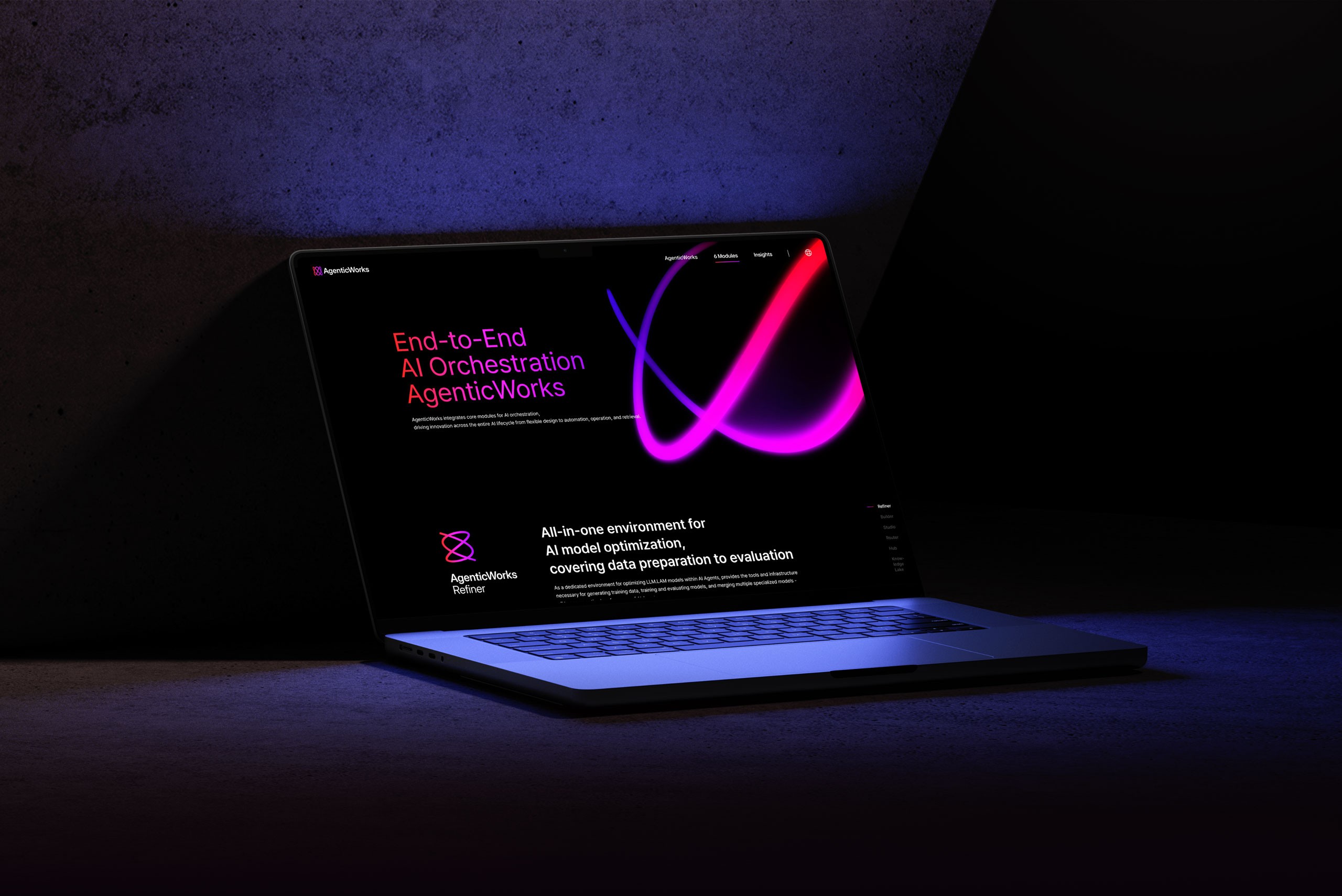 UX/UI 측면에서는 각 모듈의 성격이 분명하게 드러나면서도 전체적으로는 하나의 통합된 플랫폼으로 인식될 수 있도록 설계했습니다. AgenticWorks 플랫폼을 구성하는 6개의 핵심 모듈을 소개하고, 각 모듈이 Agentic AI 구축과 운영 과정에서 어떤 역할을 하는지 한눈에 이해할 수 있도록 시각화했습니다.