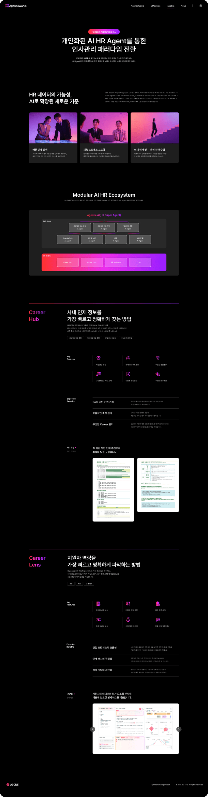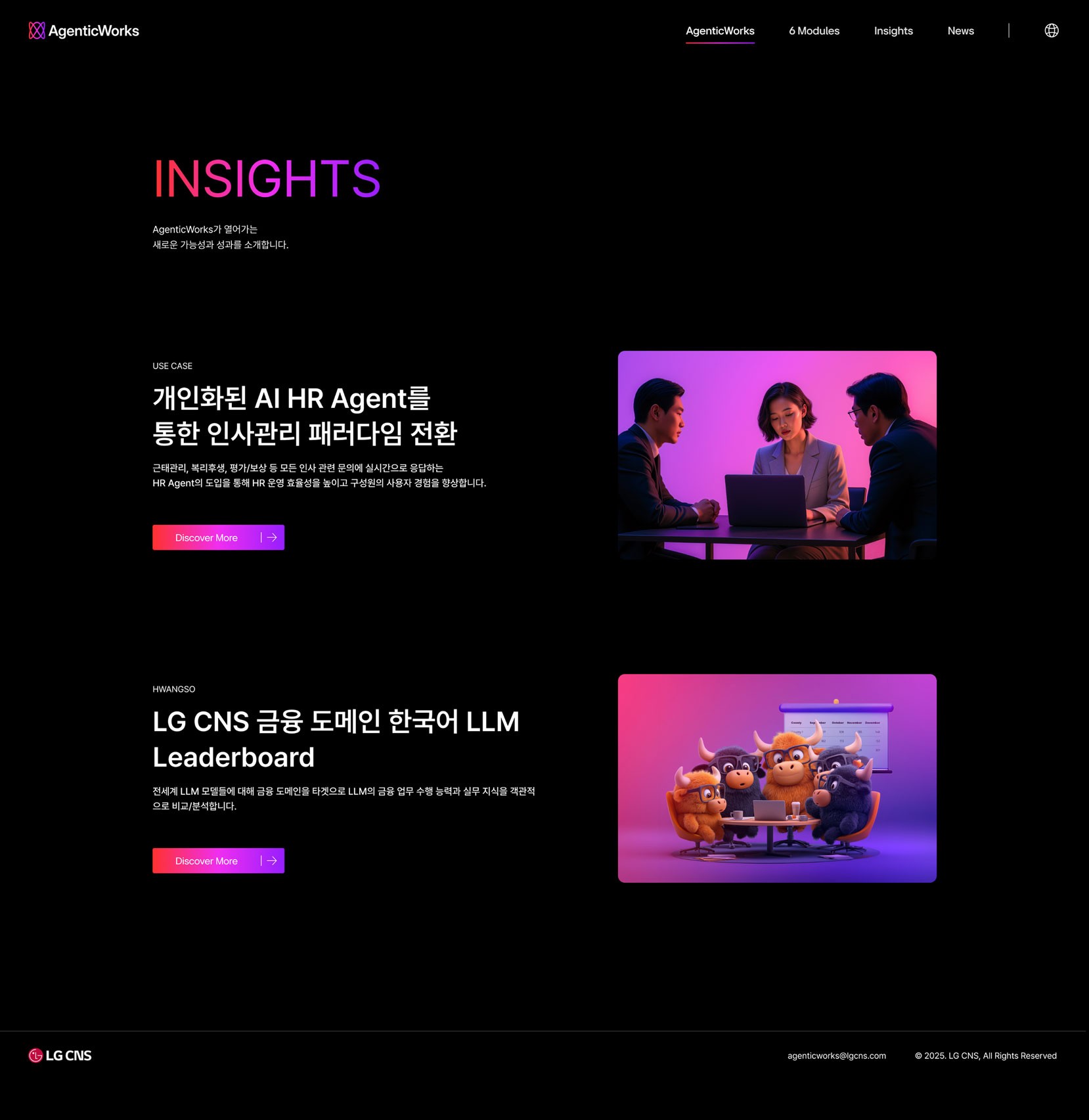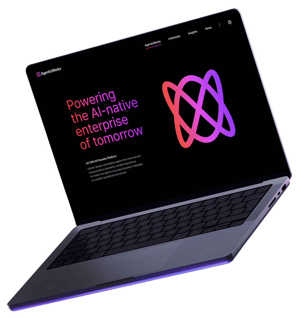 하루가 다르게 발전하는 AI는 업무 환경은 물론 산업 전반까지 빠르게 바꾸고 있습니다. 이에 대응하기 위해 많은 기업들이 AI 도입의 필요성을 느끼고 있지만 정작 어떤 서비스를 선택해야 할지, 기존 시스템과 어떻게 연결해야 할지, 실제 업무에 어떻게 적용해야 할지를 판단하는 일은 여전히 쉽지 않은 과제입니다. LG CNS의 AgenticWorks는 이러한 어려움을 해결하기 위해 개발된 통합 AX 플랫폼입니다. 다양한 AI를 하나의 시스템처럼 연결하고, 복잡한 모델을 에이전트(Agent) 형태로 손쉽게 활용할 수 있도록 지원해 기업이 자사 환경에 최적화된 AI 시스템을 빠르게 구축할 수 있도록 돕습니다. 또한 설치형 기반으로 설계되어 보안과 확장성을 모두 갖추고 있으며, 이를 통해 AI를 개념적 도입 수준에 머무르지 않고 실제 업무에 적용 가능한 실질적인 도구로 구현합니다. 웹사이트는 AgenticWorks의 경쟁력과 성능을 효과적으로 전달할 수 있도록 오케스트레이션(Orchestration) 플랫폼의 개념과 이를 구성하는 6개의 핵심 모듈을 중심으로 구성했습니다. 기업이 필요에 따라 기능을 유연하게 조합할 수 있는 플랫폼의 특성과, 다양한 시스템을 유기적으로 연결하는 확장성을 시각적으로 표현함으써 AgenticWorks가 단순한 AI 솔루션이 아닌 실질적인 Agentic AI 인프라 플랫폼이라는 점을 명확하게 전달하고자 했습니다.