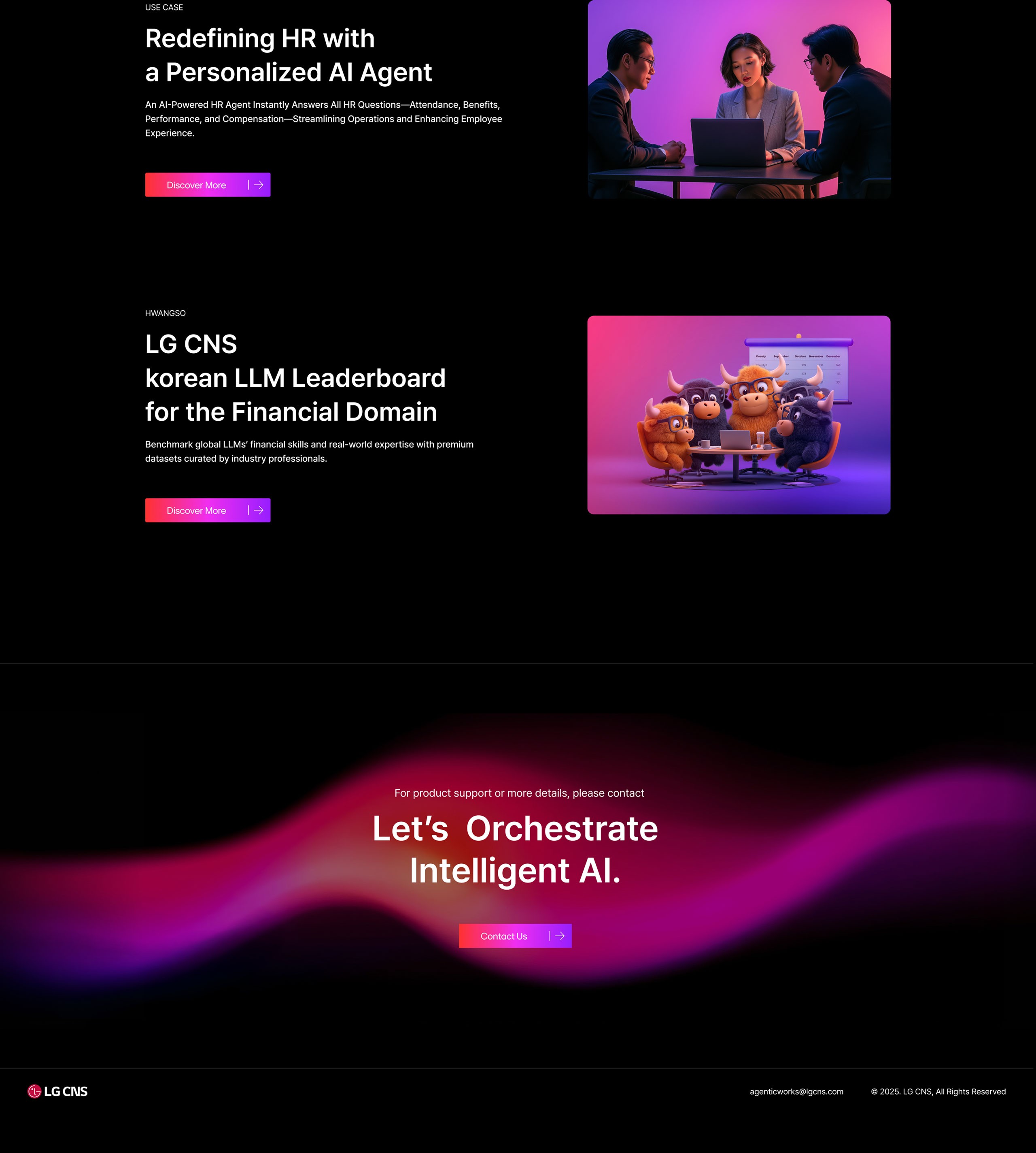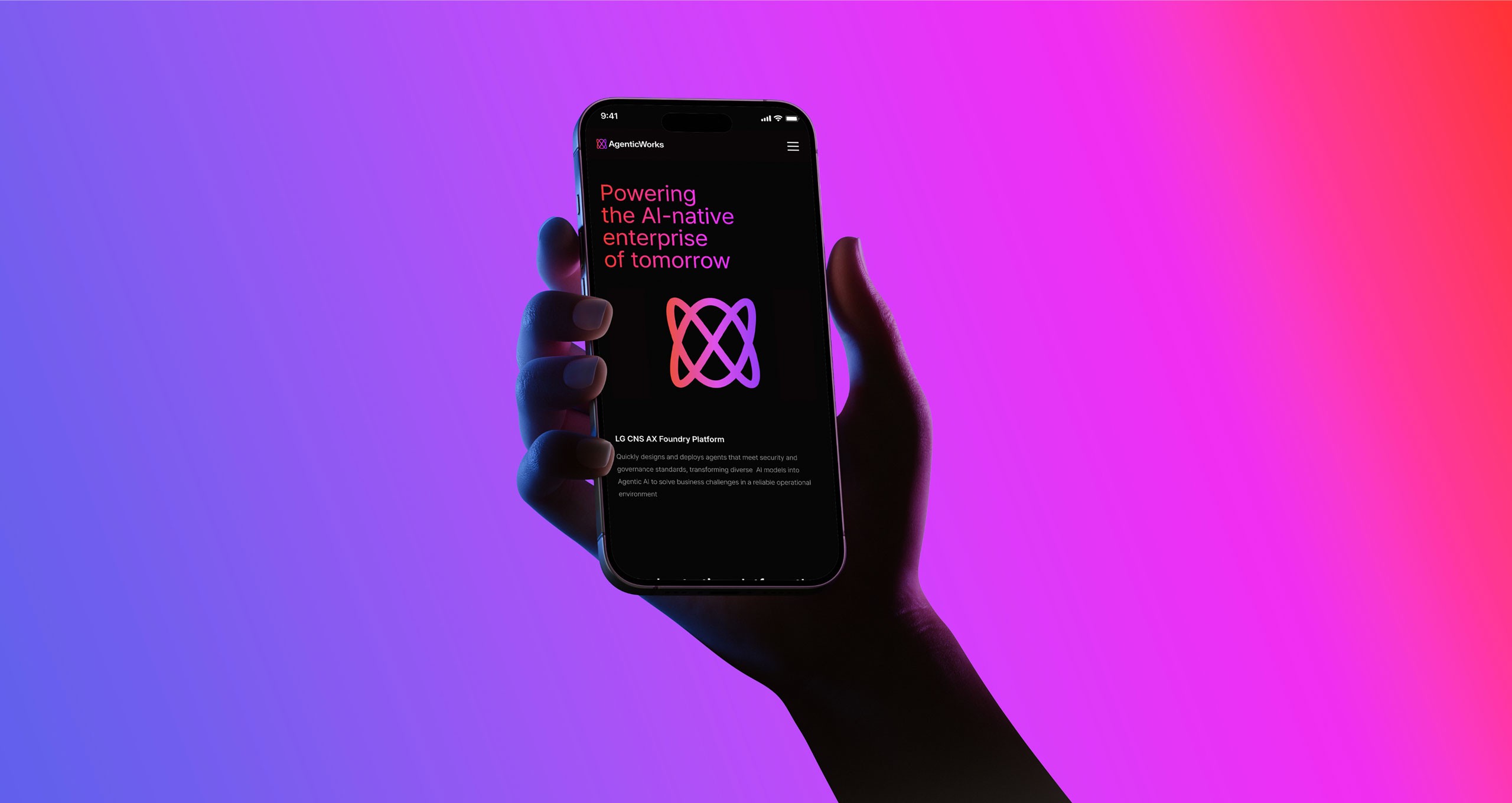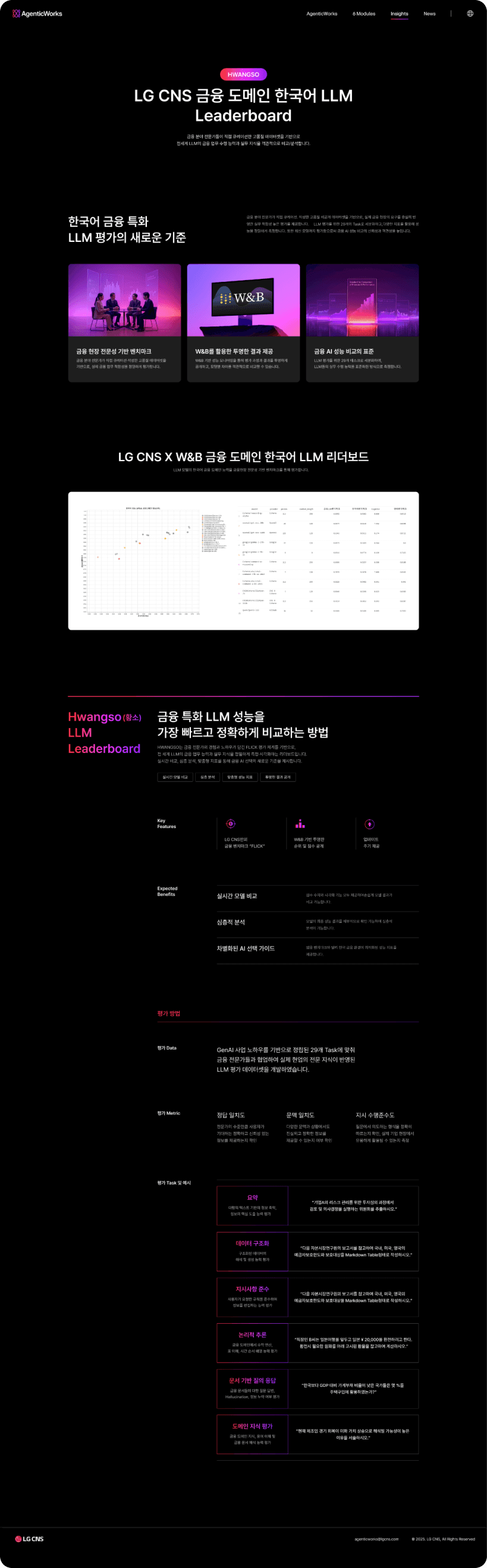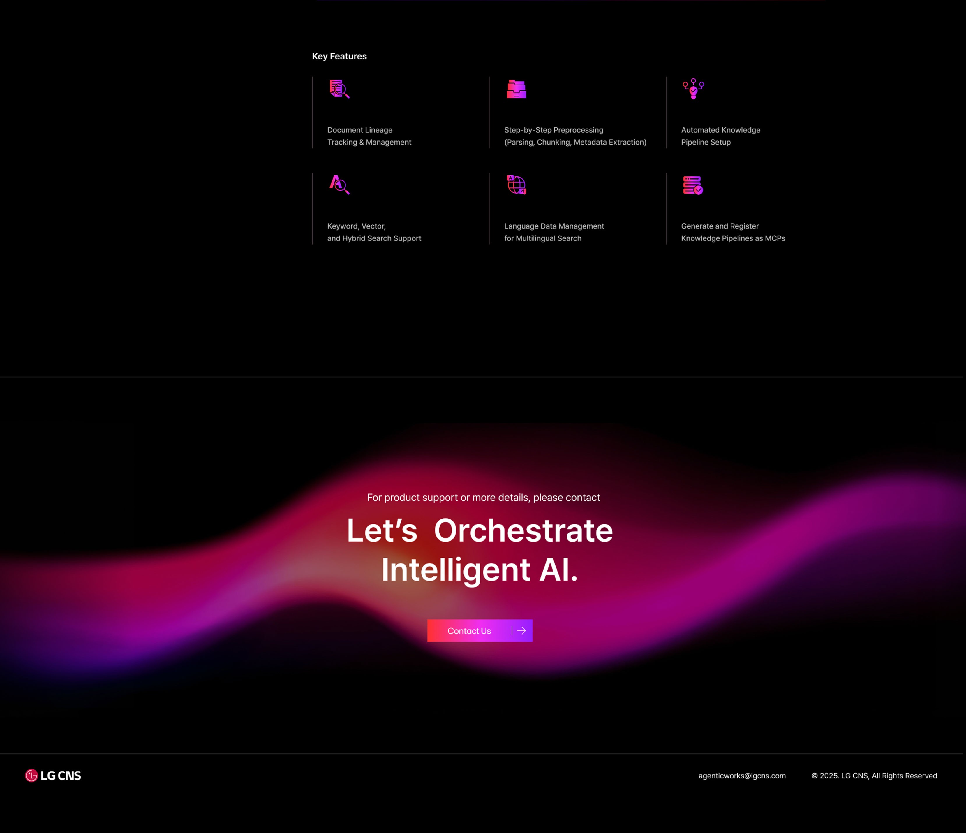 하루가 다르게 발전하는 AI는 업무 환경은 물론 산업 전반까지 빠르게 바꾸고 있습니다. 이에 대응하기 위해 많은 기업들이 AI 도입의 필요성을 느끼고 있지만 정작 어떤 서비스를 선택해야 할지, 기존 시스템과 어떻게 연결해야 할지, 실제 업무에 어떻게 적용해야 할지를 판단하는 일은 여전히 쉽지 않은 과제입니다. LG CNS의 AgenticWorks는 이러한 어려움을 해결하기 위해 개발된 통합 AX 플랫폼입니다. 다양한 AI를 하나의 시스템처럼 연결하고, 복잡한 모델을 에이전트(Agent) 형태로 손쉽게 활용할 수 있도록 지원해 기업이 자사 환경에 최적화된 AI 시스템을 빠르게 구축할 수 있도록 돕습니다. 또한 설치형 기반으로 설계되어 보안과 확장성을 모두 갖추고 있으며, 이를 통해 AI를 개념적 도입 수준에 머무르지 않고 실제 업무에 적용 가능한 실질적인 도구로 구현합니다. 웹사이트는 AgenticWorks의 경쟁력과 성능을 효과적으로 전달할 수 있도록 오케스트레이션(Orchestration) 플랫폼의 개념과 이를 구성하는 6개의 핵심 모듈을 중심으로 구성했습니다. 기업이 필요에 따라 기능을 유연하게 조합할 수 있는 플랫폼의 특성과, 다양한 시스템을 유기적으로 연결하는 확장성을 시각적으로 표현함으써 AgenticWorks가 단순한 AI 솔루션이 아닌 실질적인 Agentic AI 인프라 플랫폼이라는 점을 명확하게 전달하고자 했습니다.