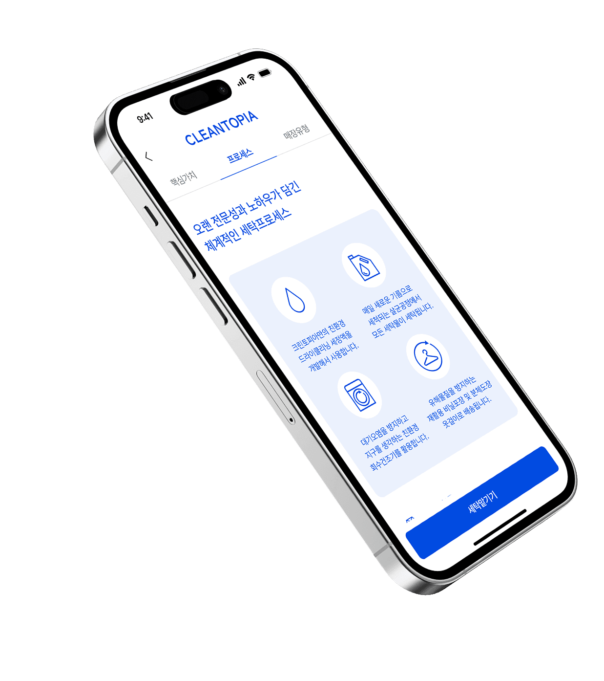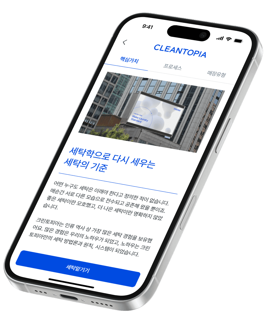 크린토피아는 전국 2,000여 개 매장을 보유한 대한민국 No.1 세탁서비스 브랜드입니다. 그동안 크린토피아는 오프라인 매장을 중심으로 사업을 운영해왔으나, 이로 인해 빠르게 성장하고 있는 O2O(Online to Offline) 서비스들과 비교해 디지털 경쟁력에서 다소 뒤처질 수밖에 없었습니다. 이에 크린토피아는 모바일 중심으로 재편되는 시장 환경에 효과적으로 대응하고, 태국·베트남 등 글로벌 시장으로의 진출을 준비하기 위해 모바일 앱의 전면적인 리뉴얼을 추진하게 되었습니다. 저희는 이번 리뉴얼 프로젝트의 목표를 단순한 시각적 개선을 넘어, 고객이 브랜드와 만나는 가장 결정적인 접점으로서 모바일 앱을 재정의하고, 비즈니스 목표를 달성하기 위한 핵심 채널로 발전시키는 데 두었습니다. 고객들이 디지털 공간에서도 세탁 후의 깨끗하고 상쾌한 기분을 느낄 수 있도록, 모든 페이지 사이에 일관된 톤앤매너를 정립하고 복잡했던 세탁 프로세스를 간소화하는 데 초점을 맞추어 UI/UX 디자인을 진행하고, 전체적인 앱 반응 속도를 향상시켜 더욱 매끄럽고 쾌적한 사용 경험을 제공하고자 했습니다.