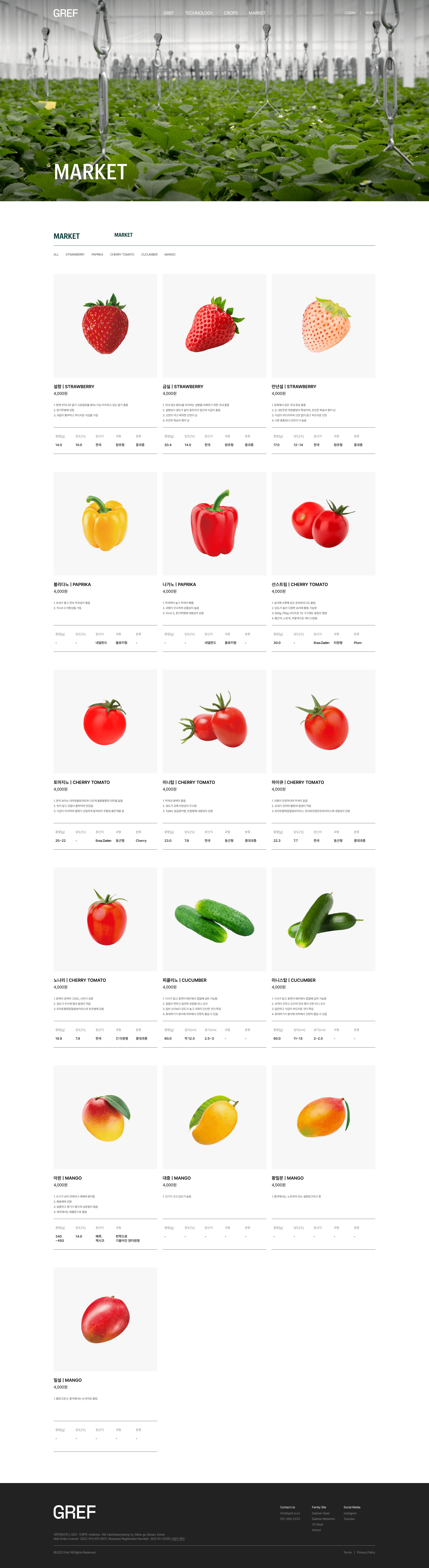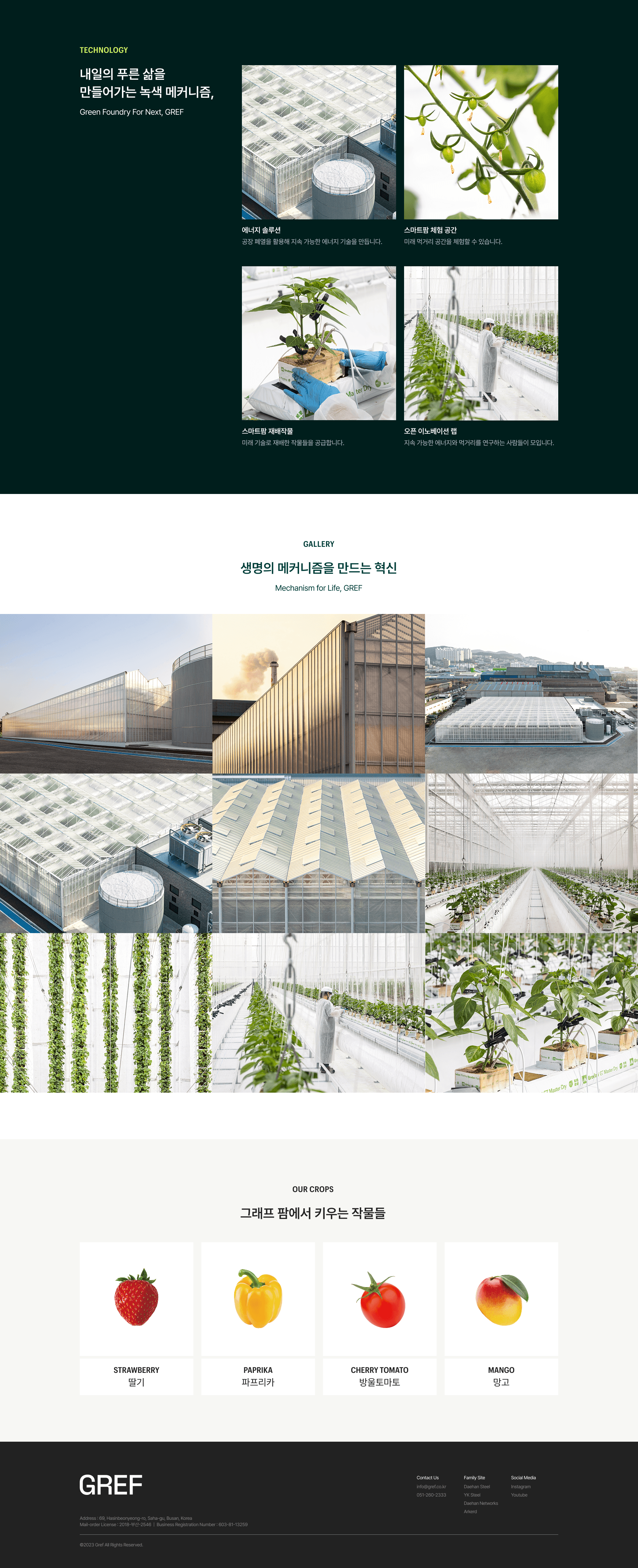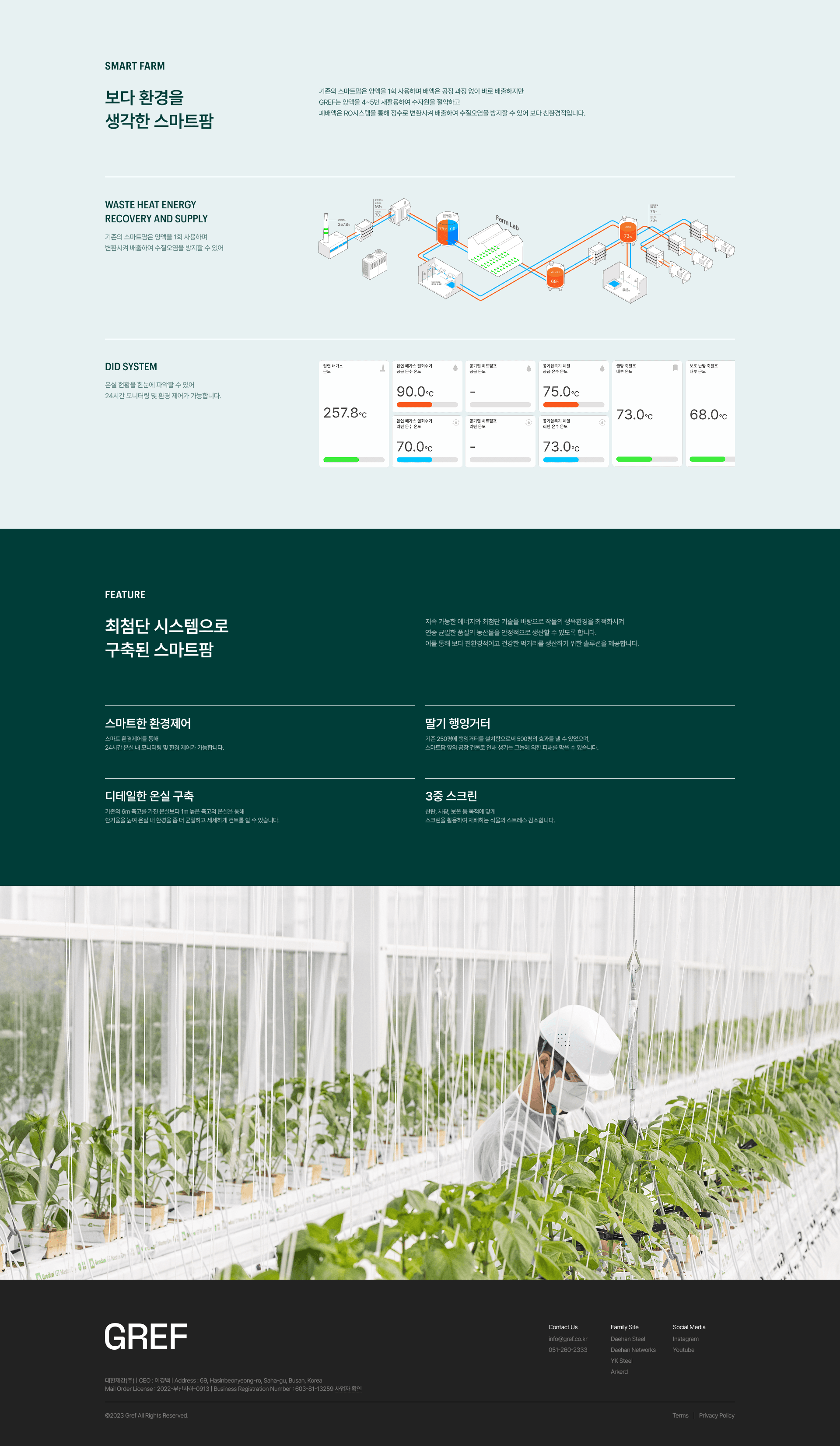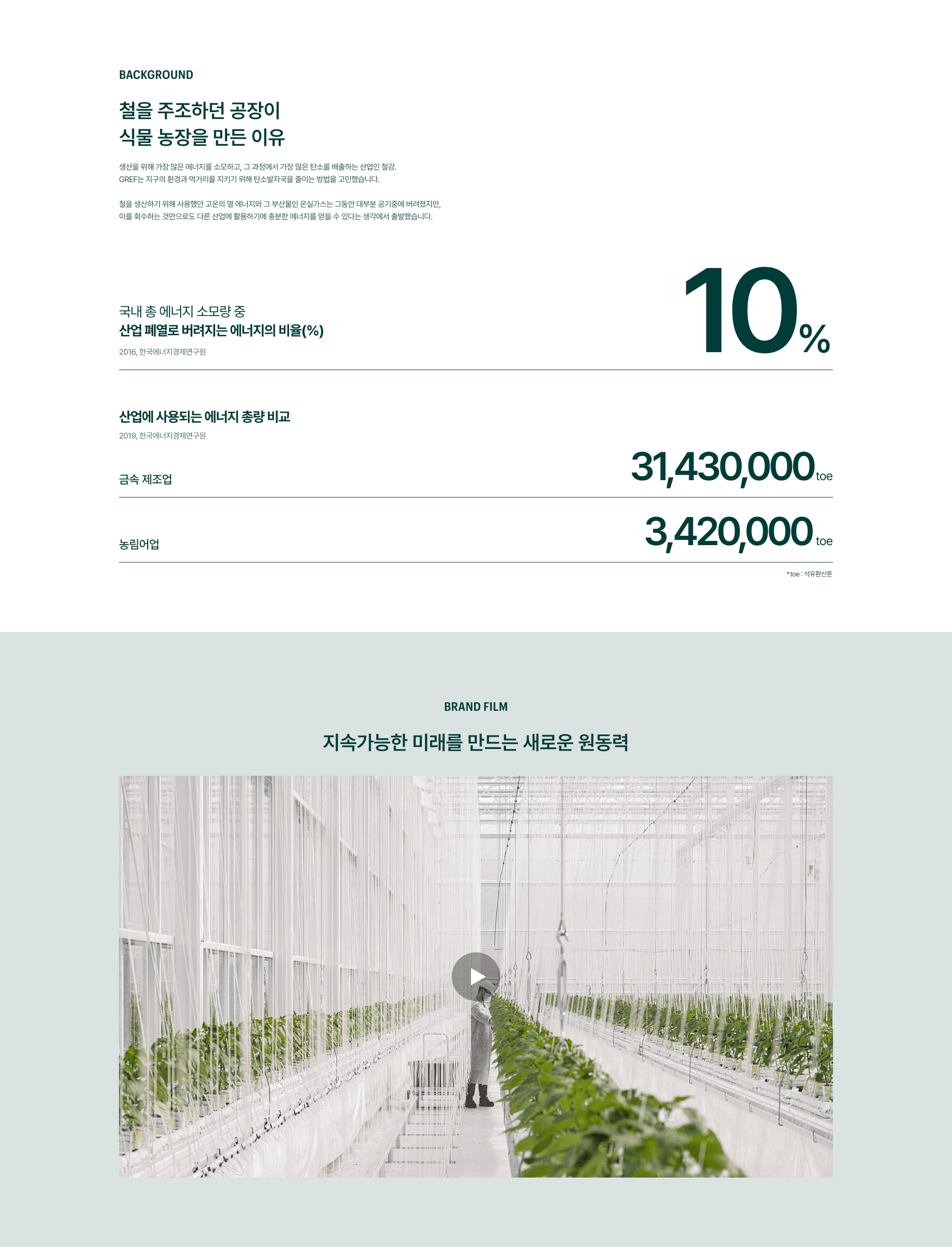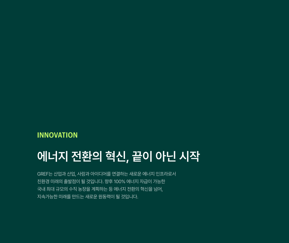GREF(그레프)는 철강 공장의 고온 폐열을 회수해 온실의 성장 에너지로 전환하는 탄소중립 에너지 솔루션 브랜드입니다. “철강의 열기가 푸른 숨으로 되살아난다”는 비전을 실현하기 위해, 브랜드의 혁신적 가치와 기술력을 직관적으로 보여줄 수 있는 디지털 플랫폼이 필요했습니다. GREF 웹사이트는 브랜드의 친환경 철학을 시각적으로 구현하며, 깔끔하고 현대적인 UI 속에서 기술적 데이터와 지속가능성 메시지를 효과적으로 전달하도록 설계되었습니다. 특히, 산업 폐열을 회수했을 때의 효과(연간 약 1억 1천만 원 연료비 절감, CO₂ 235톤 감축)를 그래픽과 통계로 표현해 사용자가 기술의 가치를 체감할 수 있도록 구성했습니다. 또한, 에너지 솔루션·농업 솔루션·재배 공간·오픈 이노베이션 랩 등 GREF의 사업 구조를 명확히 정리해 브랜드의 전문성과 비전을 쉽게 이해할 수 있도록 했습니다. GREF 웹사이트는 단순한 기업 소개를 넘어, 폐열을 에너지로 전환해 지속가능한 미래를 여는 디지털 브랜드 허브로 완성되었습니다.