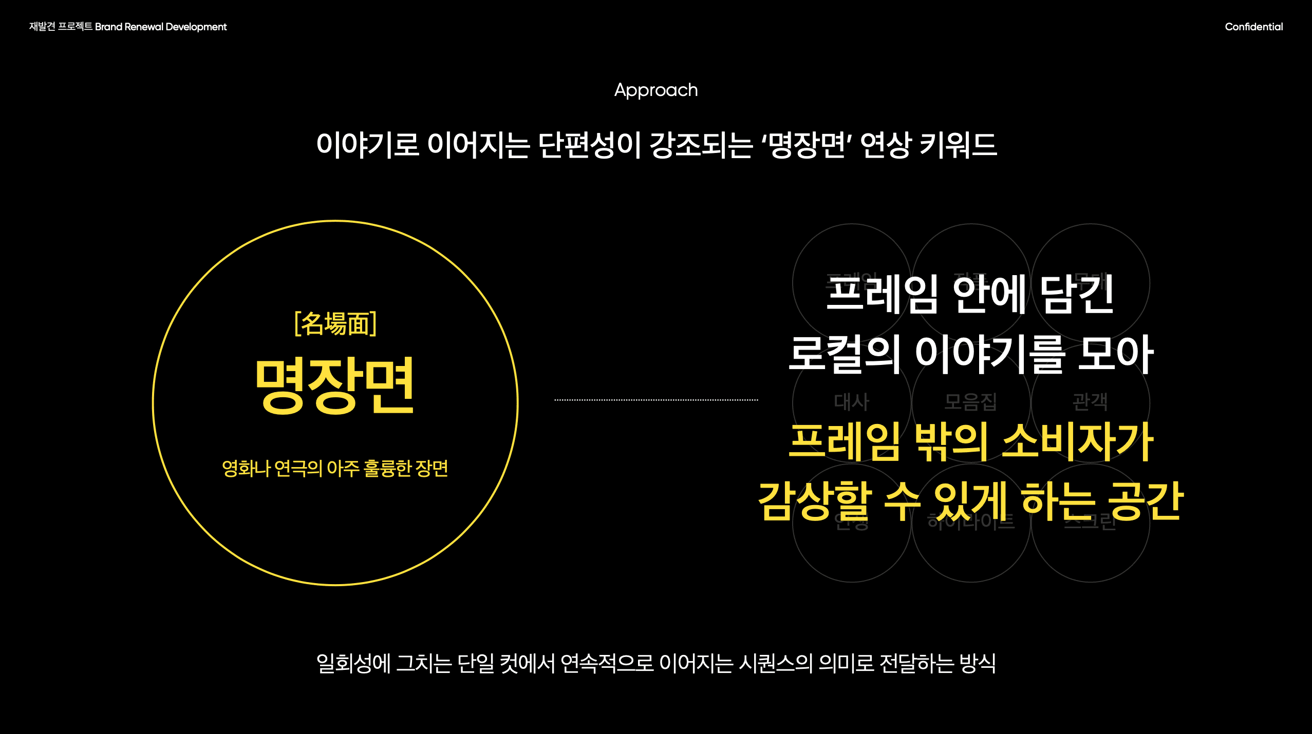 하지만 그런 형식적 접근이 오히려 브랜드 간 유사성을 가중시키는 것을 보면서, 우리는 조금 다른 방향으로 시선을 옮겼습니다. ‘좋은 상품’이라는 관점이 아니라 ‘잊고 있었던 장면’이라는 관점에서, 고객이 그 상품을 만나고 지나치는 그 찰나의 순간에 어떤 풍경이 열릴 수 있을지를 상상해보았습니다. 그 결과, ‘극장’, ‘장면(Scene)’, ‘포착’이라는 키워드가 자연스럽게 떠올랐습니다.