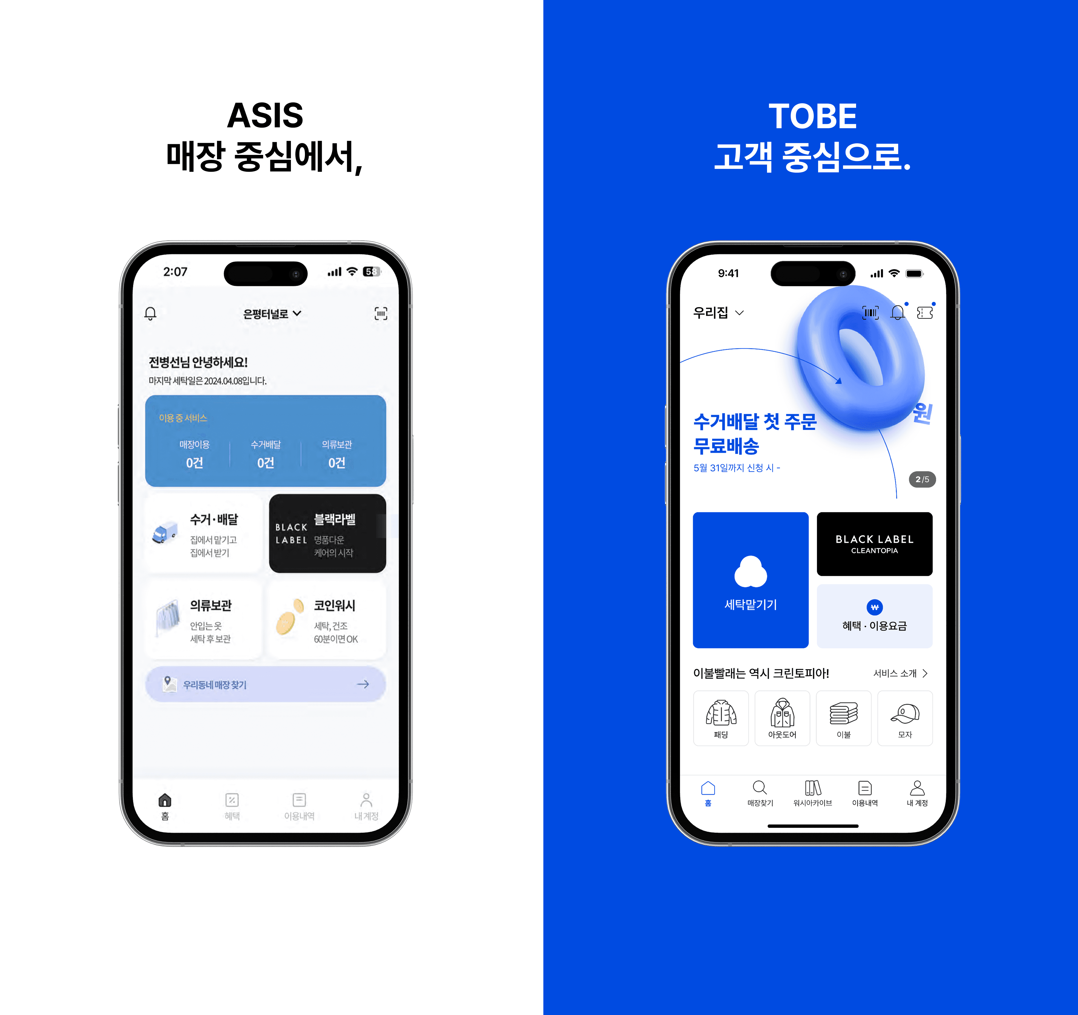 크린토피아는 국내 최대의 오프라인 세탁 네트워크를 보유한 브랜드입니다. 그러나 반대로 말하면, 디지털 경쟁력에서는 후발 주자에 가까웠습니다. 런드리고나 세탁특공대와 같은 신생 브랜드들이 O2O 시장을 빠르게 점유해가는 동안, 크린토피아는 다소 늦게 움직였고, 그만큼 디지털 전환의 필요성은 더욱 절실했습니다. 이번 앱 리뉴얼 프로젝트는 단순히 ‘앱을 다시 만드는 것’을 넘어, 브랜드 전체의 디지털 UX를 새롭게 정의하는 작업이었습니다.