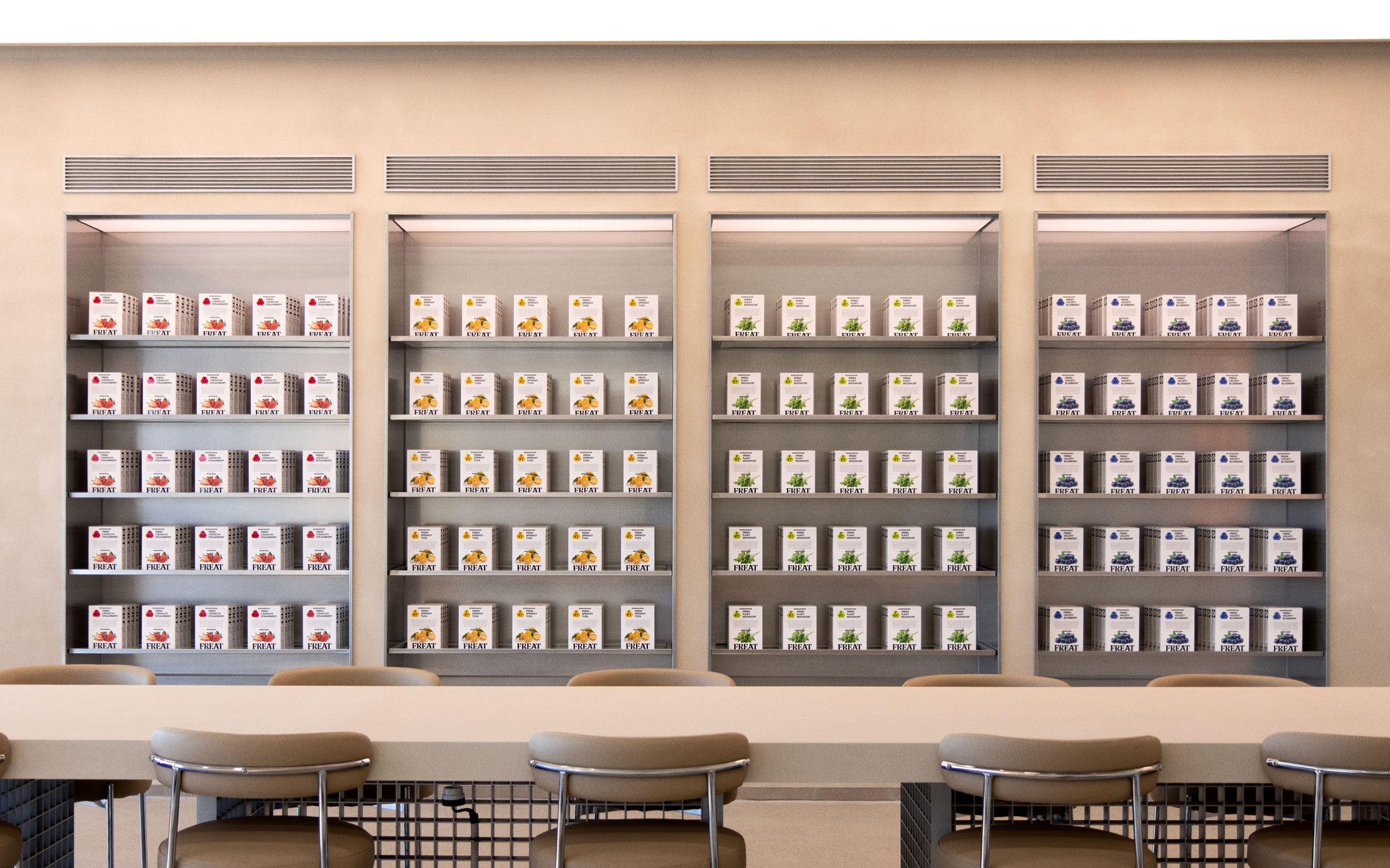 전남 신안군은 1000개가 넘는 섬으로 이뤄진 도서 지역으로, 이 중 육지와 가장 가까운 섬인 압해도는 다른 섬들을 연결하는 허브이자 관문과 같은 곳 입니다. 압해도에 위치한 압해농협은 늘어난 지역 관광 수요와 새로운 부지로의 이전 계획에 맞춰, 농협과 하나로마트의 시너지를 극대화 할 수 있는 베이커리 카페를 구상하고 있었습니다. 아무리 한적한 지역이라도 카페 한 두 곳은 쉽게 발견될 만큼 포화된 커피전문점 시장. 인접한 목포시 뿐만 아니라, 대상지 주변에도 많은 경쟁 공간들이 있었기에, 이번 프로젝트에서 가장 중요한 부분은 ‘굳이 왜 이곳에 와야 하는가?’에 대한 소비자 관점의 답을 제시하는 것이었습니다. 높은 연령대의 지역 주민들이 부담없이 찾아 올 수 있는 곳, 먼 지역의 젊은 여행자들도 한 번쯤 들러보고 싶은 곳. 농협이지만 농협같지 않고, 매력적이지만 낯설지는 않은 곳… 다소 모순적일 수 있는 목표였지만 신사업으로서의 성공 가능성과 직결된 부분이기도 했습니다. 우리는 이러한 조건들을 모두 충족하는 장소성으로서 ‘슈퍼마켓’을 생각했습니다. 남녀노소 누구나 찾아오는 곳이자, 익숙함과 신선함이 공존하는 곳. 농협이라 더 공감이 되는 곳. 슈퍼마켓을 재해석한 브랜드 컨셉은 브랜드 네이밍과 비주얼 아이덴티티, 인테리어와 고객 접점 전반에 적용되었습니다.