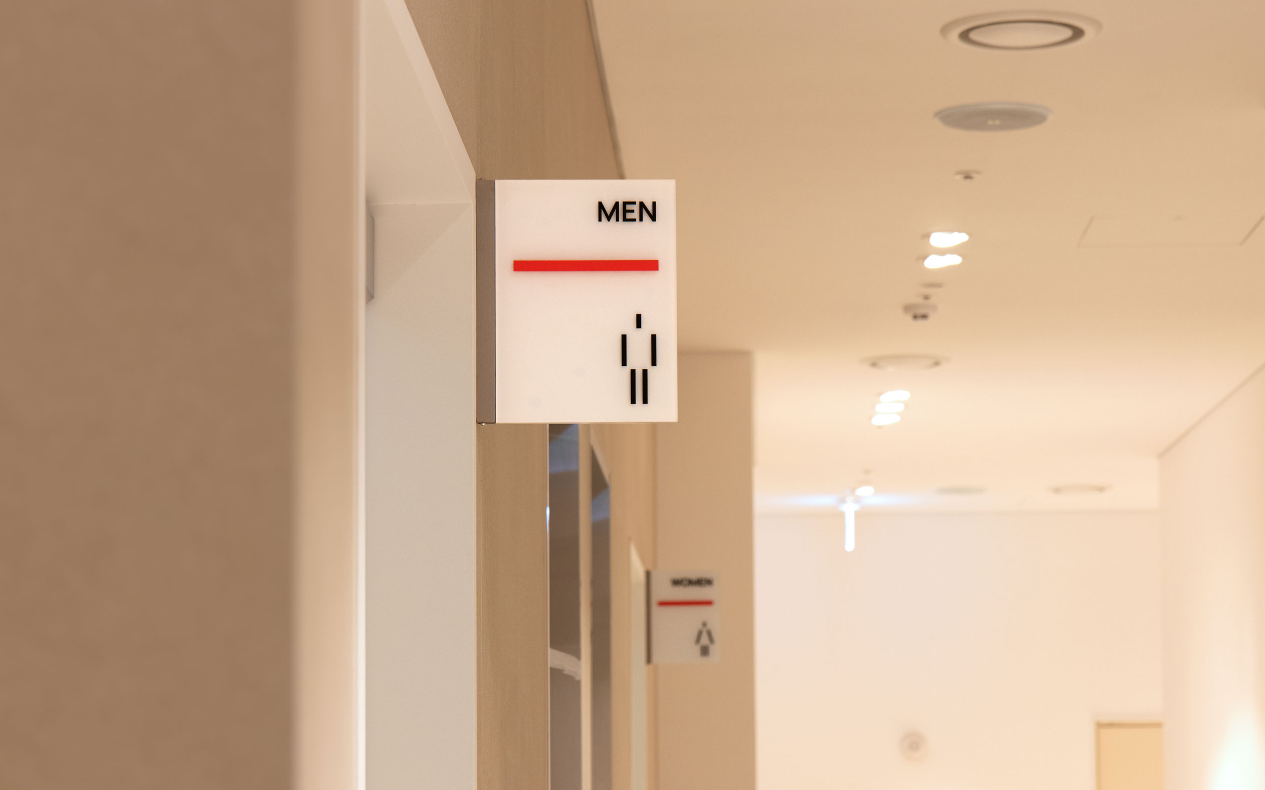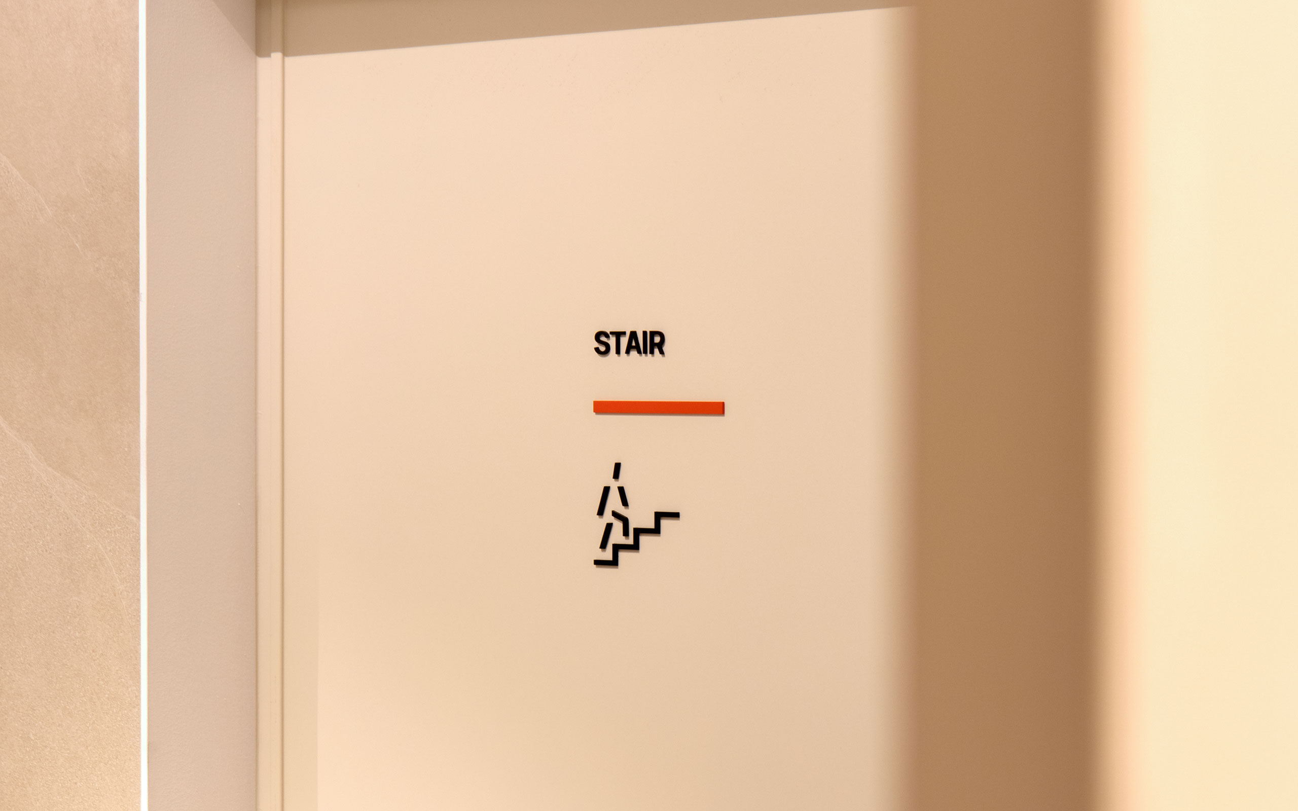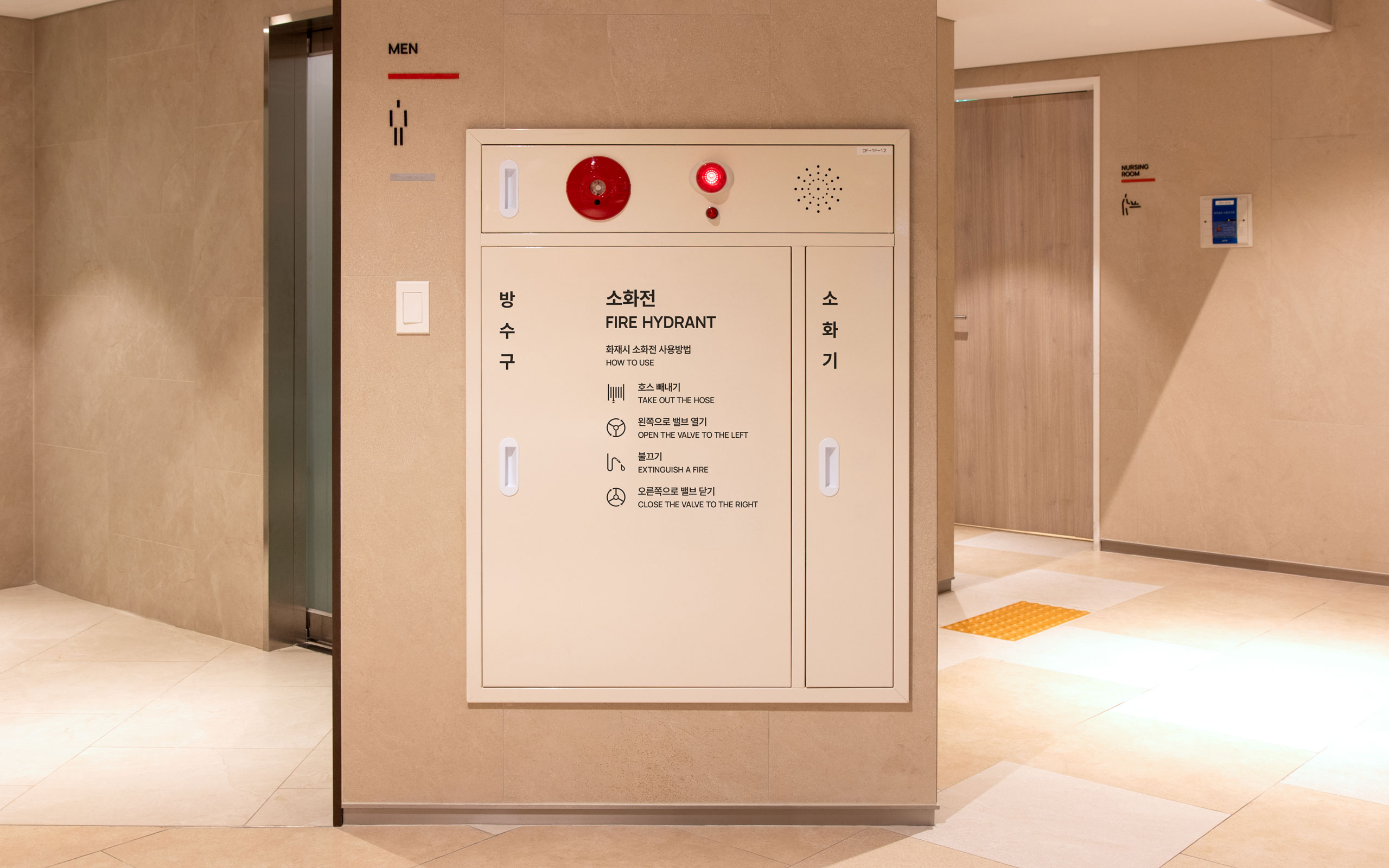 The pictograms within the wayfinding system were designed to incorporate simple linear forms whenever possible, harmonizing with the linear elements inherent in the concept of light penetration and connection that traverses the space. Where necessary, they were linked with curves to form a unified visual system.