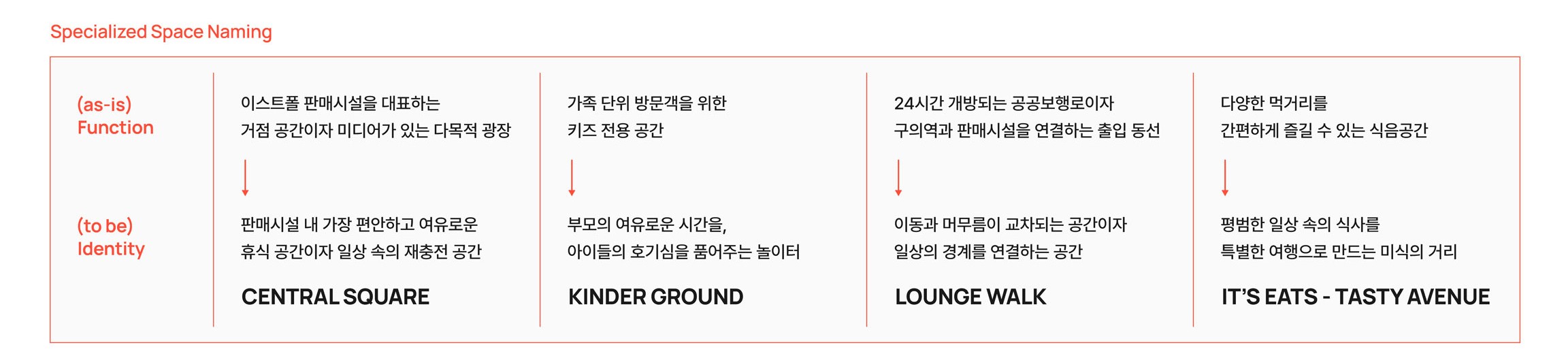 특화공간이 이스트폴에 갖는 목적성은 크게 두 가지였습니다. 여러 시설 사이에 끼인 공간적 특성으로 인해 경로처럼 그냥 지나치기 쉽다는 단점을 극복하고, 상업공간 내에 목적지로 기억될 만한 곳들을 만들어 주는 것이었습니다. SNS와 디지털 마케팅이 주를 이루는 현재의 환경 속에서 기억에 남을 만한 핵심 공간을 만드는 것 또한 중요했습니다. 이를 위해 공간 속에서 독립된 장소성과 방문의 동기를 제공하는 보행로, 미디어 파사드, F&B 와 키즈 공간을 지정하고, 이 공간들에 기존 디자인 컨셉인 입체감과 투과의 개념을 유지하면서, 각 공간의 특성을 반영할 수 있는 사이니지를 제작하였습니다.