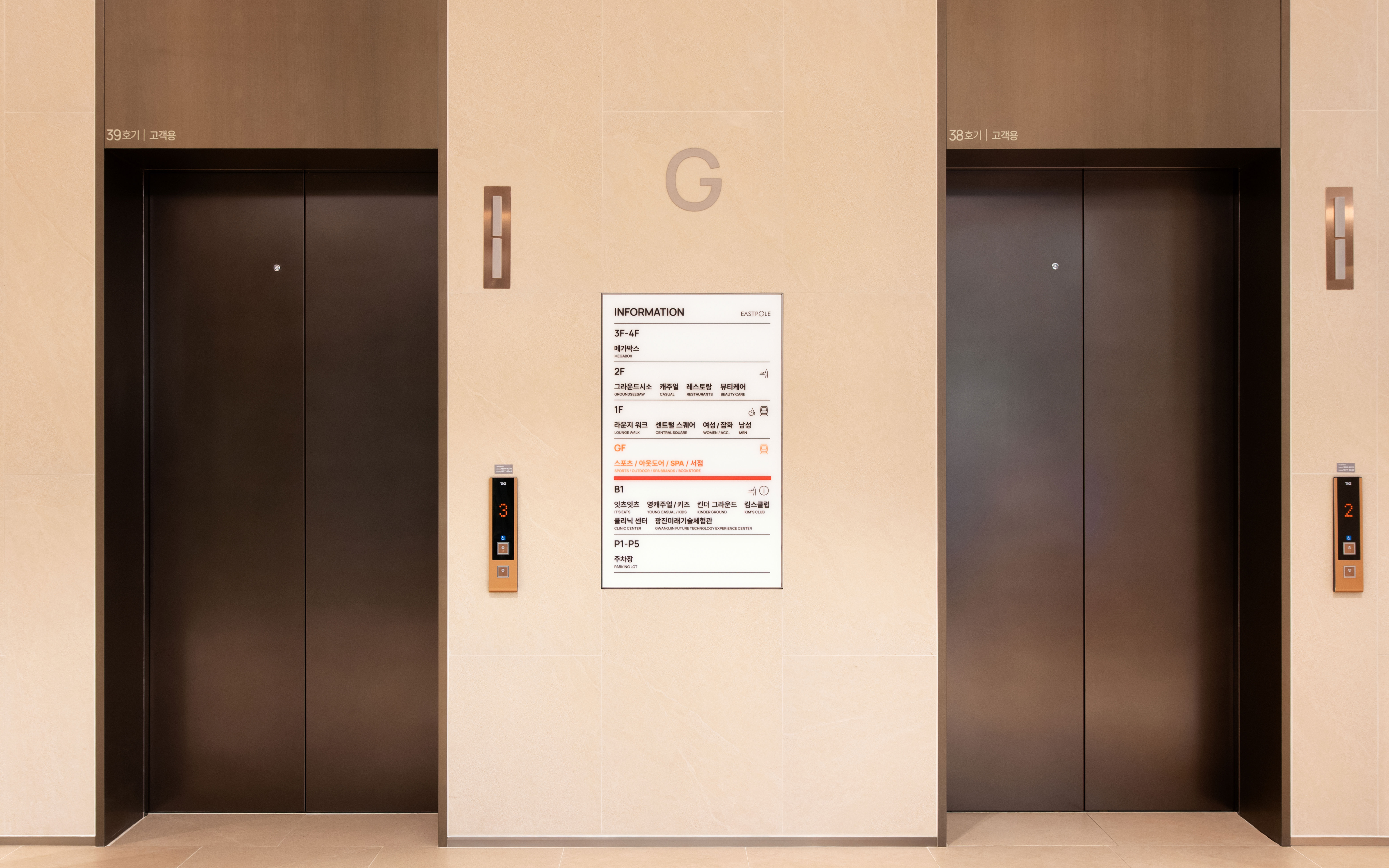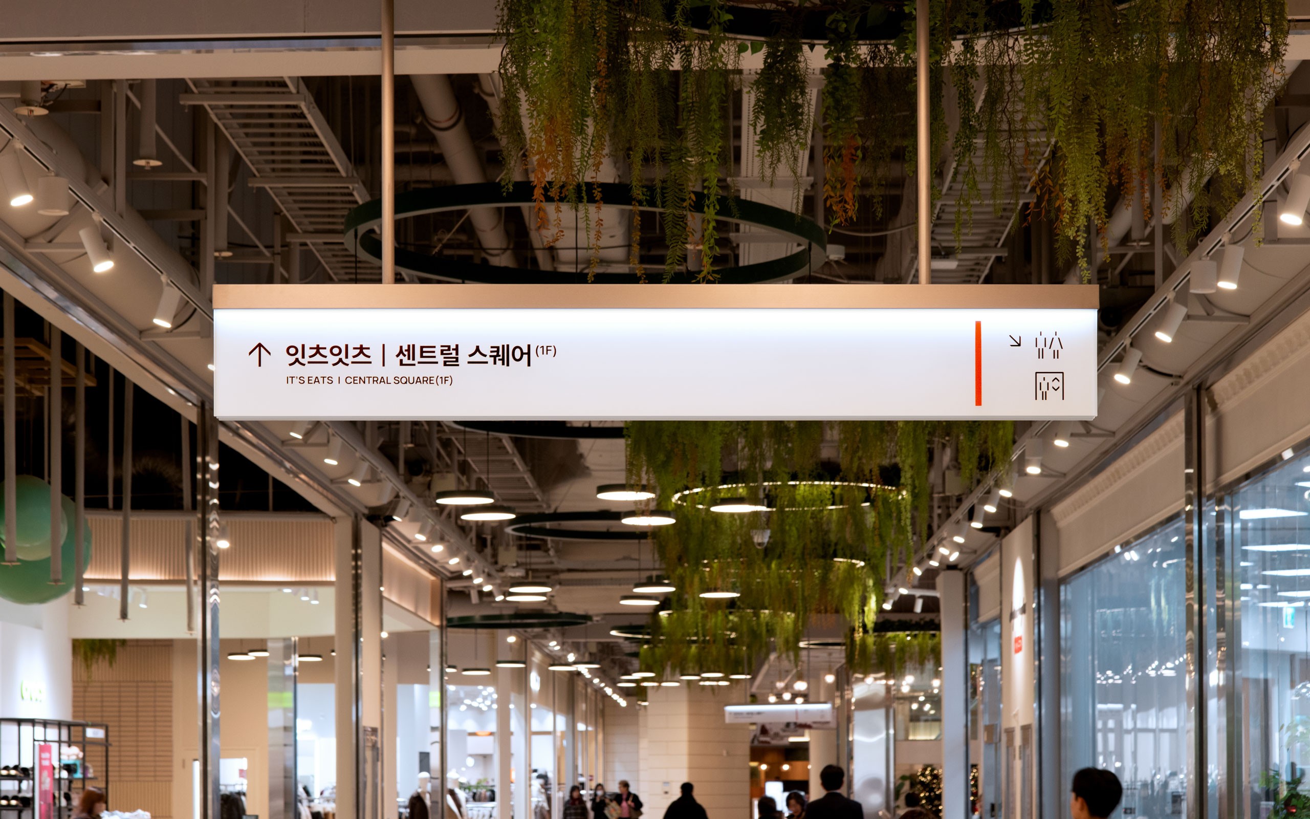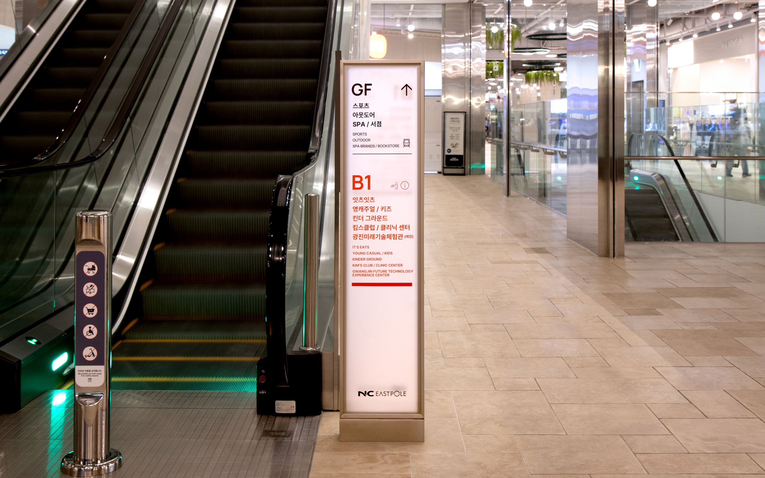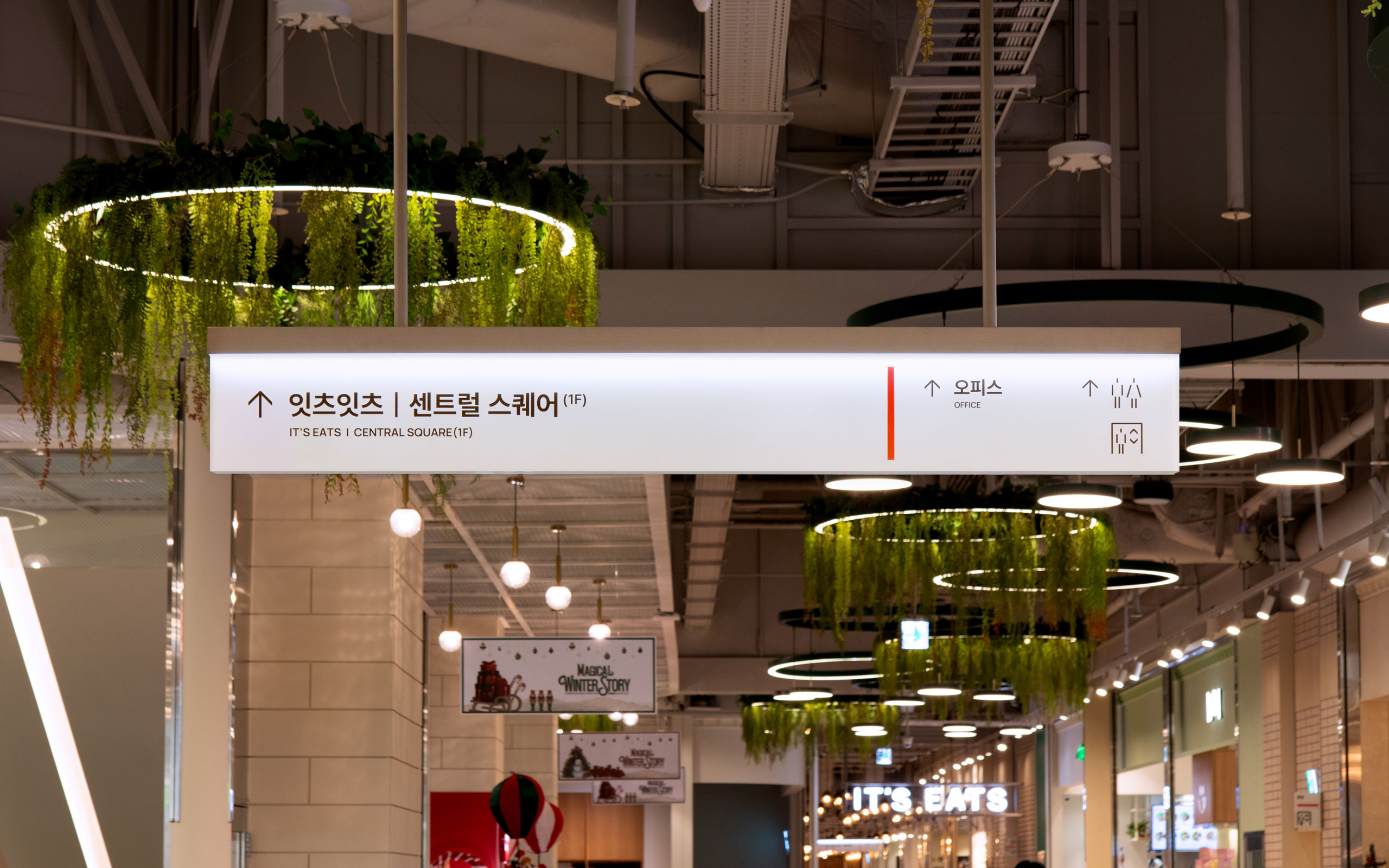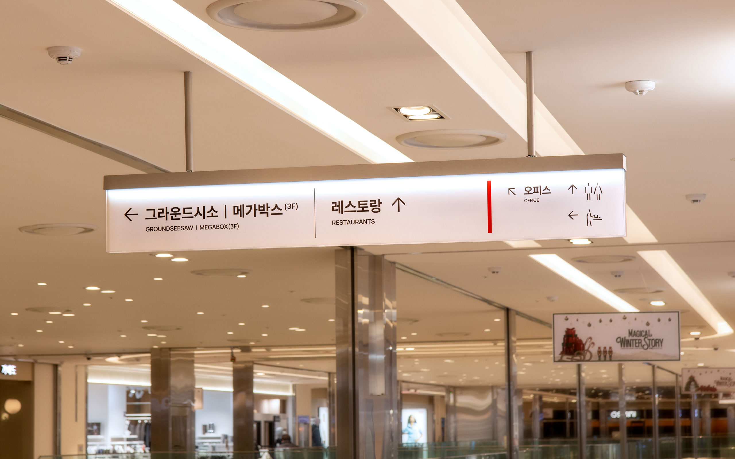 The primary purpose in EASTPOLE's signage design was to reveal its spatial characteristics. Unlike typical shopping malls that use enclosed structures to draw people inside, EASTPOLE functions as a passage connecting residences, cultural facilities, offices, public services, and the subway, while also acting as a central hub. We reinterpreted this role as a flow that traverses diverse scenes of life and unifies them.