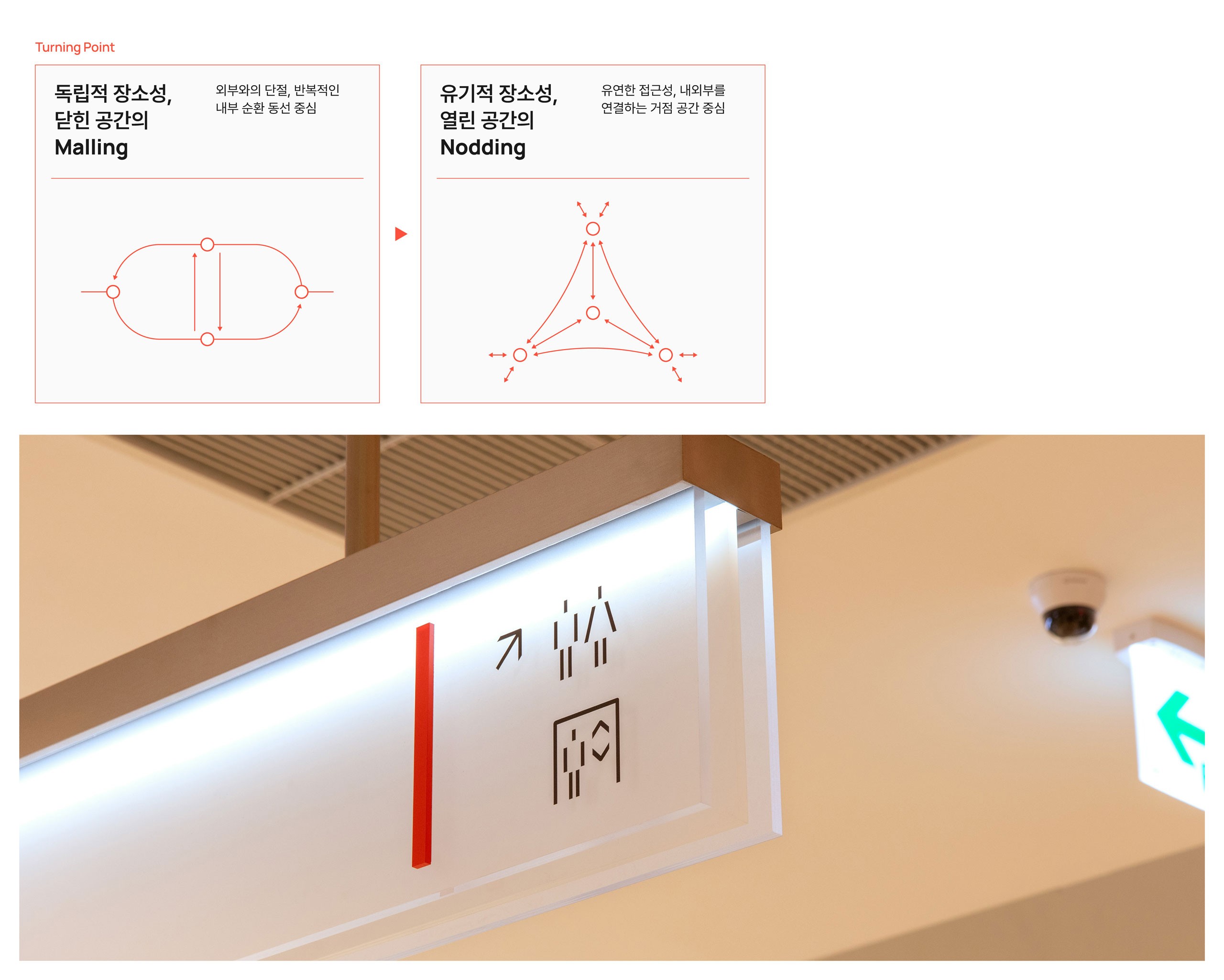 각 노드는 이스트폴을 대표하는 공간으로써, 이 노드들을 통해 전체 시설의 위치와 관계를 보다 뚜렷하게 인지하고